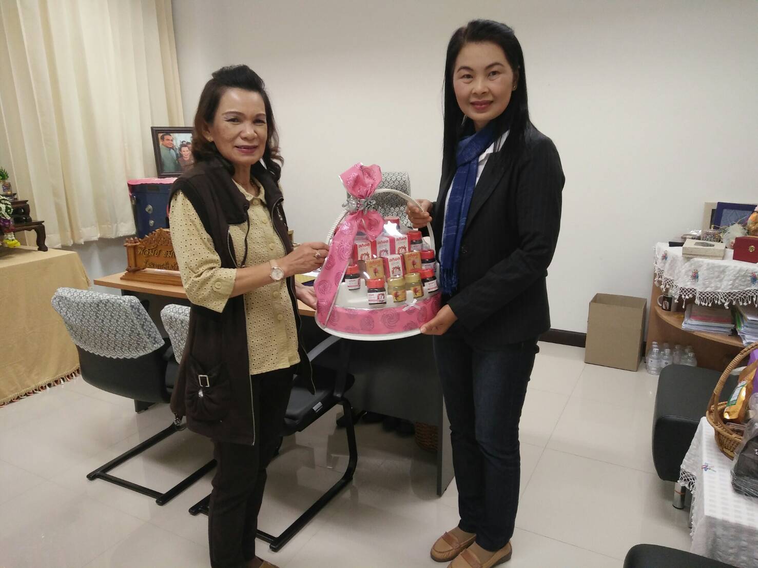 วันที่ ๑๗ มกราคม ๒๕๖๑ นางคำประไพ รักษาขันธ์  พัฒนาการอำเภอสันติสุข จ.น่าน มอบกระเช้าอวยพรปีใหม่และขอคำแนะนำในการปฏิบัติราชการจากนางพิศมัย ชมเชย พัฒนาการจังหวัดน่าน