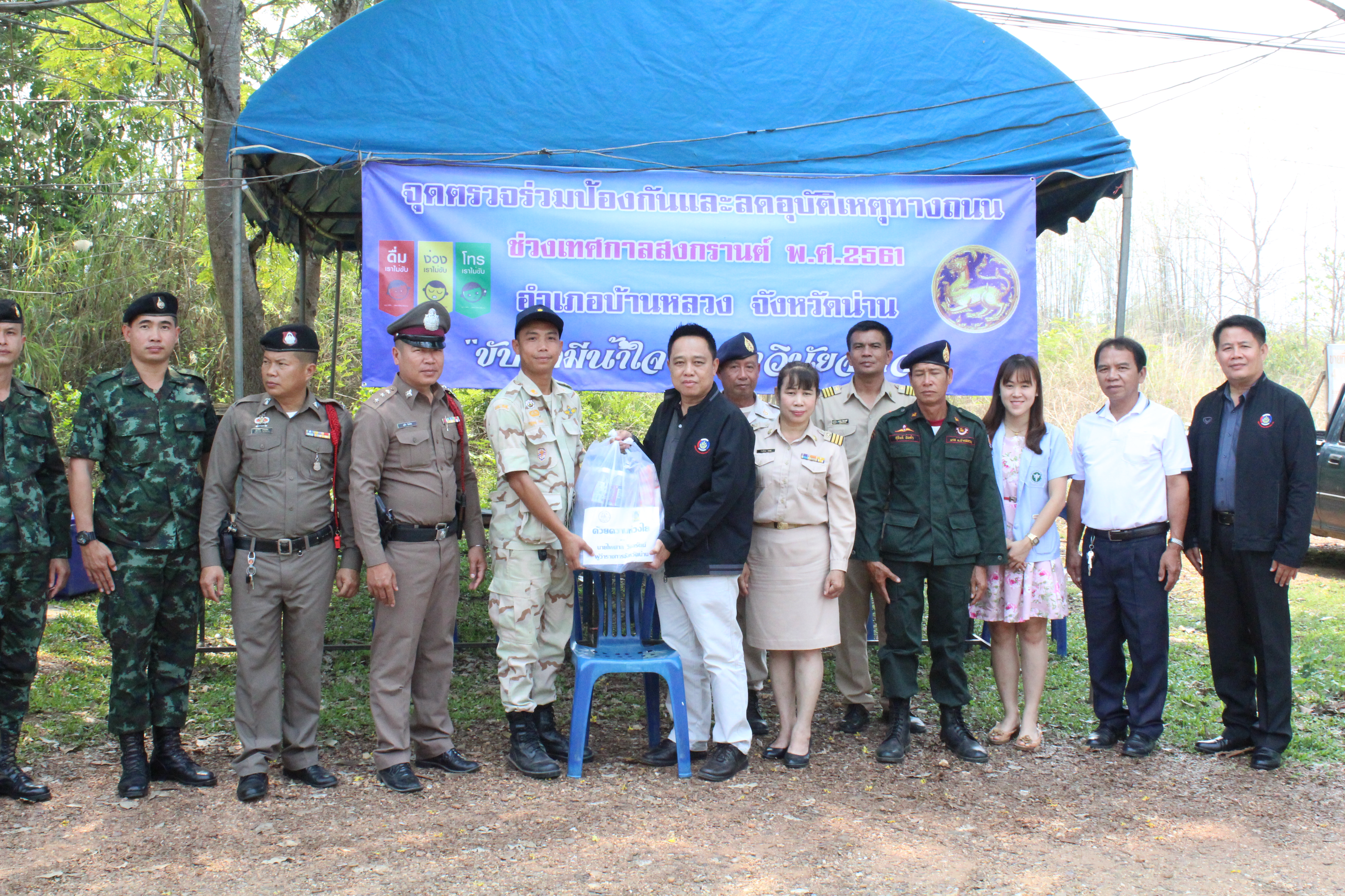 วันที่ 11 เมษายน 2561 เวลา 10.30 น. นางพิสมัย ชมเชย พัฒนาการจังหวัดน่าน/คณะทำงานและเลขานุการฝ่ายติดตามประเมินผลและตรวจเยี่ยม คณะที่ 2 ตามคำสั่งจังหวัดน่าน ที่ 5349/2561 ลงวันที่ 28 มีนาคม 2561 เรื่อง จัดตั้งศูนย์ปฏิบัติการป้องกันและลดอุบัติเหตุทางถนนช่วงเทศกาลสงกรานต์ พ.ศ.2561 จังหวัดน่าน ได้มอบหมายให้ นายประจักษ์จิตร สายนะที หัวหน้ากลุ่มงานสารสนเทศการพัฒนาชุมชน สำนักงานพัฒนาชุมชนจังหวัดน่าน พร้อมด้วย ว่าที่ ร.ท.เฉลิมชัย ชมพูวุฒิกุล นักวิชาการพัฒนาชุมชนชำนาญการ ได้ออกติดตามประเมินผลและตรวจเยี่ยมจุดตรวจของศูนย์ปฏิบัติการร่วมระดับอำเภอบ้านหลวง พร้อมมอบถุงอาหารและเครื่องดื่มจากท่านผู้ว่าราชการจังหวัดน่าน (นายไพศาล วิมลรัตน์) เพื่อสร้างขวัญและกำลังใจแก่เจ้าหน้าที่ผู้ปฏิบัติงาน