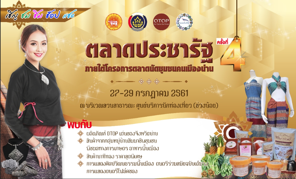 จังหวัดน่าน โดยสำนักงานพัฒนาชุมชนจังหวัดน่าน เชิญ ชม ชิม ช็อป แชะ ในงานตลาดประชารัฐ ครั้งที่ 4  ภายใต้โครงการตลาดนัดชุมชนคนเมืองน่าน วันที่ 27- 29 กรกฏาคม 2561 ณ บริเวณสวนสาธารณะ ศูนย์บริการนักท่องเที่ยว ข่วงน้อย อำเภอเมืองน่าน จังหวัดน่าน ในงานพบกับ