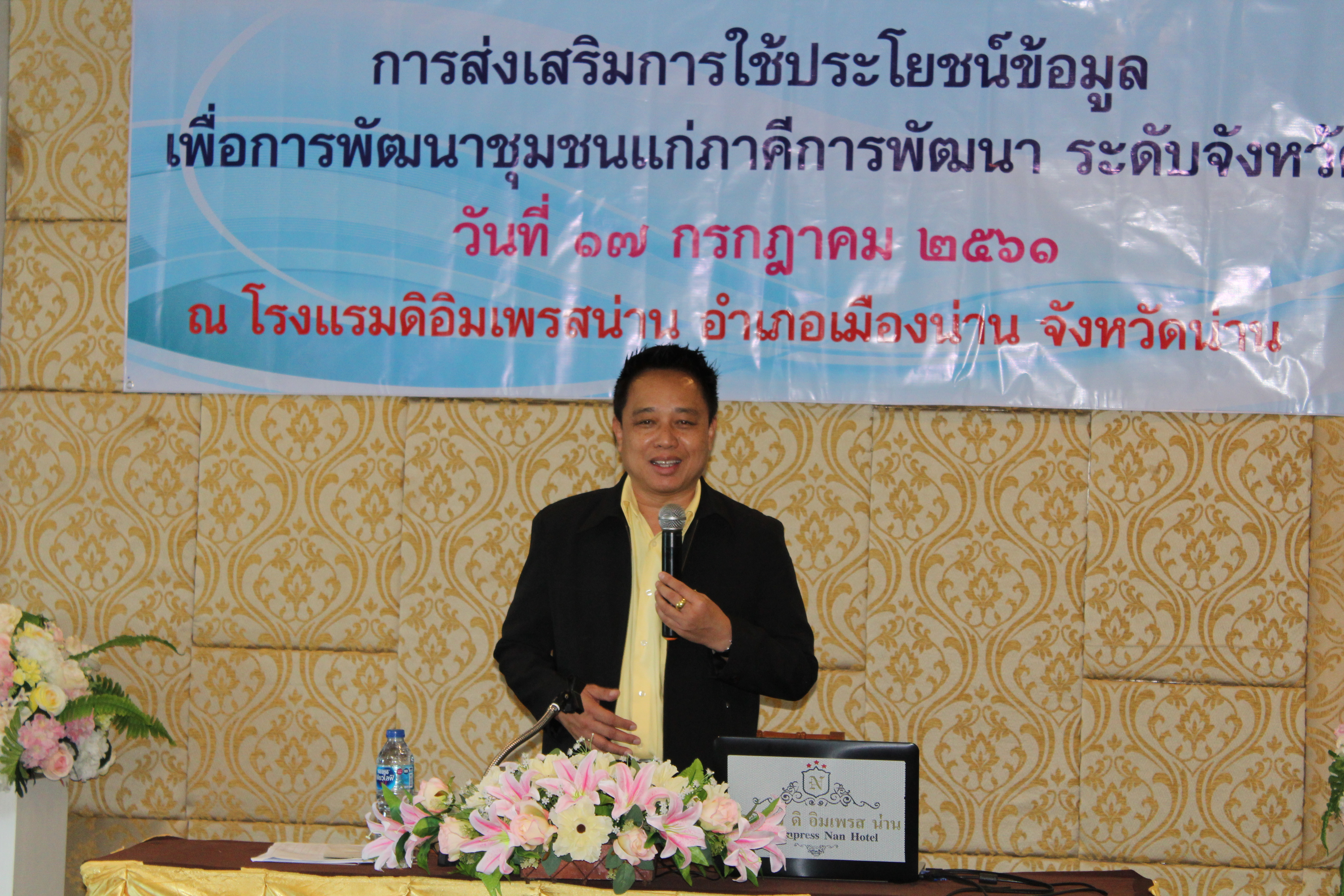 วันอังคารที่ 17 กรกฎาคม 2561 เวลา 09.00 น. นางพิสมัย ชมเชย พัฒนาการจังหวัดน่าน มอบหมายให้ นายประจักษ์จิตร สายนะที หัวหน้ากลุ่มงานส่งเสริมการพัฒนาชุมชน สำนักงานพัฒนาชุมชนจังหวัดน่าน เป็นประธานการประชุมโครงการส่งเสริมการใช้ประโยชน์ข้อมูลเพื่อการพัฒนาชุมชนแก่ภาคีการพัฒนา ระดับจังหวัด ประกอบด้วยผู้แทนหน่วยงานภาคีการพัฒนา และองค์กรปกครองส่วนท้องถิ่นในจังหวัด 50 หน่วยงาน ซึ่งคาดว่าไม่น้อยกว่า 235 หน่วยงาน เกิดความรู้ความเข้าใจในการใช้ประโยชน์เพื่อพัฒนาคุณภาพชีวิตของพี่น้องประชาชน ตามหลักการ/การใช้ประโยชน์จากข้อมูลความจำเป็นพื้นฐาน (จปฐ.) โดยการใช้งานโปรแกรมวิเคราะห์ข้อมูลชุมชนเพื่อพัฒนาระบบสารสนเทศชุมชน : CIA (Community Information Radar Analysis) ในการใช้วิเคราะห์ข้อมูลอย่างง่าย ณ โรงแรม ดิ อิมเพรส น่าน ตำบลดู่ใต้ อำเภอเมืองน่าน จังหวัดน่าน