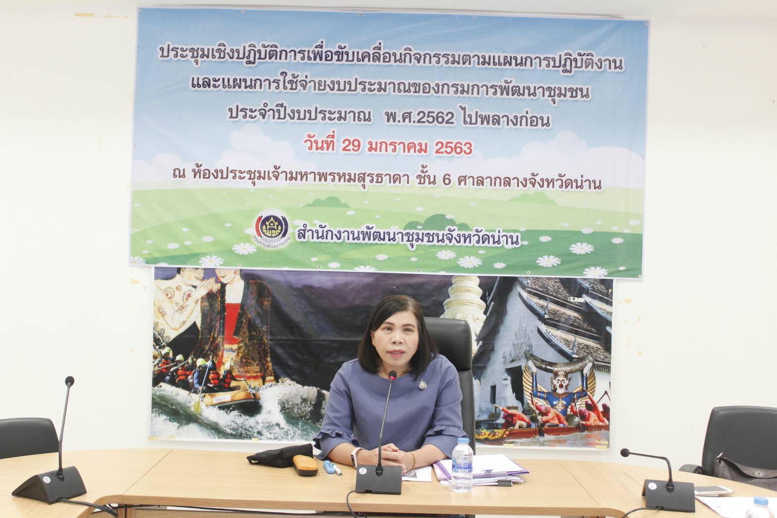 ? วันที่ 29 มกราคม 2563 สำนักงานพัฒนาชุมชนจังหวัดน่านจัดประชุมเชิงปฏิบัติการเพื่อขับเคลื่อนแผนปฏิบัติงานและแผนการใช้จ่ายงบประมาณของกรมการพัฒนาชุมชนประจำปีงบประมาณพ. ศ. 2562 ไปพลางก่อน ณ ห้องประชุมเจ้ามหาพรหม สุรธาดา ชั้น 6 ศาลากลางจังหวัดน่าน โดยนางณัฐณรี ศรีชัยยะ หัวหน้ากลุ่มงานส่งเสริมการพัฒนาชุมชน รักษาราชการแทนพัฒนาการจังหวัดน่าน เป็นประธานในการประชุมฯ กลุ่มเป้าหมายประกอบด้วยเจ้าหน้าที่พัฒนาชุมชนและอาสาพัฒนา จำนวน 75 คน
