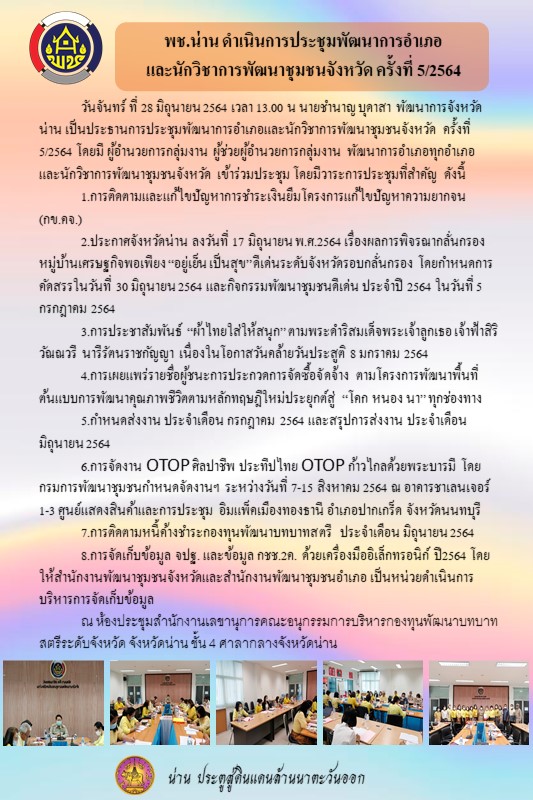 พช.น่าน ดำเนินการประชุมพัฒนาการอำเภอ และนักวิชาการพัฒนาชุมชนจังหวัด ครั้งที่ 5/2564