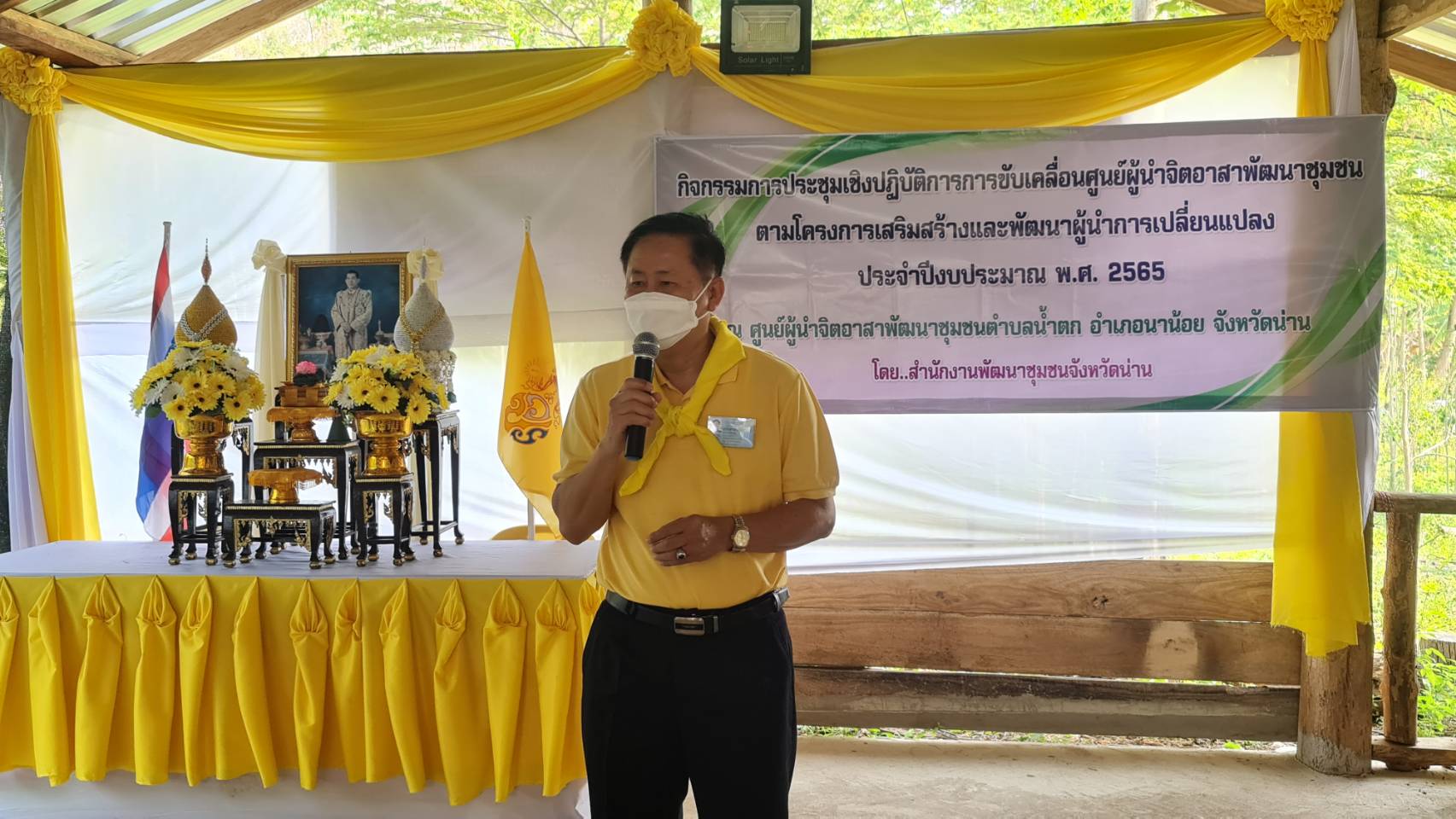 วันที่ 15-16 มีนาคม 2565 นายชำนาญ บุดาสา พัฒนาการจังหวัดน่าน เป็นประธานเปิดการประชุมเชิงปฏิบัติการขับเคลื่อนศูนย์ผู้นำจิตอาสาพัฒนาชุมชนตามโครงการเสริมสร้างและพัฒนาผู้นำการเปลี่ยนแปลง ประจำปีงบประมาณ พ.ศ.2565 ณ ศูนย์จิตอาสาพัฒนาชุมชนตำบลน้ำตก (ศูนย์เรียนรู้ฯบ้านพืชเจริญ) อำเภอนาน้อย จังหวัดน่าน โดยมีนางณัฐนรี ศรีชัยยะ ผู้อำนวยการกลุ่มงานส่งเสริมการพัฒนาชุมชน นายธงชัย ธนสถิตย์ พัฒนาการอำเภอนาน้อย และเจ้าหน้าที่พัฒนาชุมชนจังหวัดและอำเภอ เข้าร่วมฯ