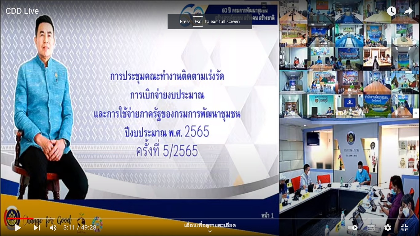 วันที่ 18 พฤษภาคม 2565 เวลา 13.00 น. นายวิฑูรย์ นวลนุกุล รองอธิบดีกรมการพัฒนาชุมชน เป็นประธานการประชุมคณะทำงานติดตามเร่งรัดการเบิกจ่ายงบประมาณและการใช้จ่ายภาครัฐของกรมการพัฒนาชุมชน ปีงบประมาณ พ.ศ.2565 ครั้งที่ 5/2565 ผ่านระบบวีดีทัศน์ทางไกล Video conference ณ ห้องประชุม war room ชั้น 5 กรมการพัฒนาชุมชน เพื่อเร่งรัดการเบิกจ่ายงบประมาณให้เป็นไปตามแผนปฏิบัติราชการของกรมการพัฒนาชุมชน โดยมีวาระการประชุมที่สำคัญดังนี้