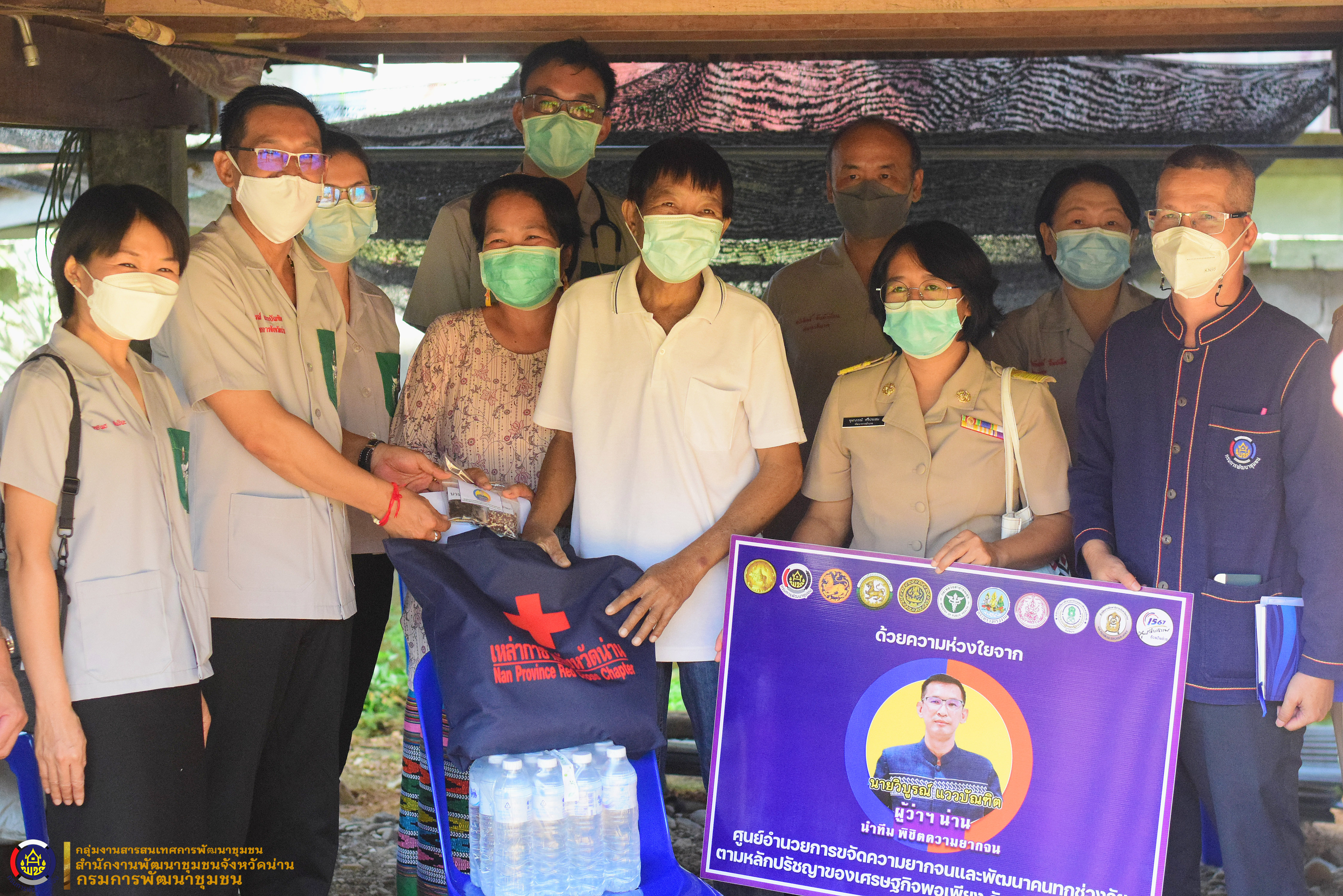 ในการนี้นายชำนาญ บุดาสา พัฒนาการจังหวัดน่าน มอบหมายให้นายชัยยะ ศรีชัยยะ ผู้อำนวยการกลุ่มงานสารสนเทศการพัฒนาชุมชน นางสาวจุฬาภรณ์ ศรีประสม พัฒนาการอำเภอนาหมื่น พร้อมด้วยนักวิชาการพัฒนาชุมชนกลุ่มงานสารสนเทศการพัฒนาชุมชน สำนักงานพัฒนาชุมชนจังหวัดน่าน และสำนักงานพัฒนาชุมชนอำเภอนาหมื่น ร่วมลงพื้นที่ตรวจเยี่ยมครัวเรือนยากจนเป้าหมาย รายงานปัญหาของครัวเรือน และผลการดำเนินงานแก้ไขปัญหาความยากจน ร่วมมอบถุงยังชีพ ต้นกล้ากล้วย และเมล็ดพันธุ์ผักสวนครัว โดยได้รับการสนับสนุนจากหน่วยงานภาคีการพัฒนาดังนี้