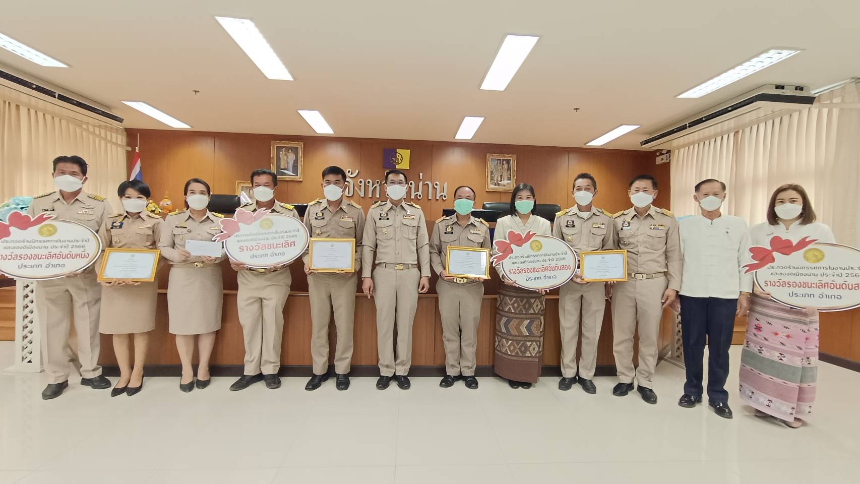 ทั้งนี้ก่อนวาระการประชุม นายวิบูรณ์ แววบัณฑิต ผู้ว่าราชการจังหวัดน่าน ได้มอบเกียรติบัตรพร้อมเงินรางวัล การประกวดร้านนิทรรศการงานประจำปี และของดีเมืองน่าน ประจำปี พ.ศ. 2566 โดยจังหวัดน่านและเหล่ากาชาดจังหวัดน่าน ร่วมกับภาคเอกชน ได้กำหนดจัดงานประจำปีและของดีเมืองน่าน เมื่อวันที่ 10-19 กุมภาพันธ์ 2566 ณ บริเวณรินน้ำน่านเชิงสะพานพัฒนาภาคเหนือ มีกิจกรรมการประกวดร้านนิทรรศการงานประจำปี และของดีเมืองน่าน แบ่งเป็น 2 ประเภท คือประเภทส่วนราชการระดับจังหวัด มีหน่วยงานส่งประกวดจำนวน 6 กระทรวง 8 หน่วยงาน ประเภทส่วนราชการระดับอำเภอ ได้รับความร่วมมือจากทุกอำเภอส่งเข้าประกวดจำนวน 15 อำเภอ ผลการประกวดดังนี้