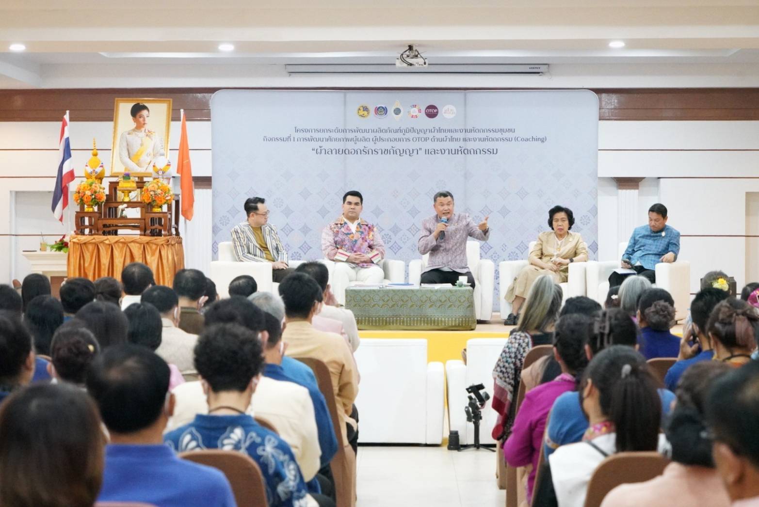 วันนี้ (22 เม.ย. 66) เวลา 10.00 น. ที่ห้องมารีน่าแกรนด์บอลรูม กัซซัน พาโนรามา รีสอร์ท ลำพูน อำเภอเมืองลำพูน จังหวัดลำพูน นายสุทธิพงษ์ จุลเจริญ ปลัดกระทรวงมหาดไทย พร้อมด้วย ดร.วันดี กุญชรยาคง จุลเจริญ นายกสมาคมแม่บ้านมหาดไทย เป็นประธานเปิดกิจกรรมการพัฒนาศักยภาพผู้ผลิต ผู้ประกอบการ OTOP ด้านผ้าไทย และงานหัตถกรรม (Coaching) “ผ้าลายดอกรักราชกัญญา” จุดดำเนินการที่ 4 จังหวัดลำพูน ตามโครงการยกระดับการพัฒนาผลิตภัณฑ์ภูมิปัญญาผ้าไทยและงานหัตถกรรมชุมชน โดยมี นายอรรษิษฐ์ สัมพันธรัตน์ อธิบดีกรมการพัฒนาชุมชน นายสันติธร ยิ้มละมัย ผู้ว่าราชการจังหวัดลำพูน พร้อมด้วยนางดวงกมล ยิ้มละมัย ประธานแม่บ้านมหาดไทยจังหวัดลำพูน นายวรงค์ แสงเมือง รองอธิบดีกรมการพัฒนาชุมชน นายอนุพงษ์ วาวงศ์มูล นายชาตรี กิตติธนดิตถ์ รองผู้ว่าราชการจังหวัดลำพูน นายโยธิน ประสงค์ความดี ปลัดจังหวัดลำพูน นายบุญส่ง ไชยมณี หัวหน้าสำนักงานจังหวัดลำพูน ผู้ตรวจราชการกรมการพัฒนาชุมชน พัฒนาการจังหวัด ผู้ผลิต ผู้ประกอบการ OTOP ผ้าไทย และสื่อมวลชน ในเขตพื้นที่จังหวัดภาคเหนือ กว่า 200 คน ร่วมในพิธีฯ โดยได้รับเกียรติจาก “คณะที่ปรึกษาโครงการผ้าไทยใส่ให้สนุก” อาทิ ดร.ศรินดา จามรมาน นักวิชาการอิสระ นายธนันท์รัฐ ธนเสฏฐการย์ ผู้เชี่ยวชาญด้านผ้าไทยและผู้เชี่ยวชาญการย้อมสีธรรมชาติ นายศิริชัย ทหรานนท์ นักออกแบบและเจ้าของแบรนด์ THEATRE นายกุลวิทย์ เลาสุขศรี บรรณาธิการบริหาร นิตยสาร VOGUE ประเทศไทย ดร.กรกลด คำสุข รองคณบดีฝ่ายนวัตกรรมทางปัญญาและวิจัย วิทยาลัยอุตสาหกรรมสร้างสรรค์ มหาวิทยาลัยศรีนครินทรวิโรฒ นายตะวัน ก้อนแก้ว ผู้ช่วยบรรณาธิการแฟชั่น VOGUE นายนุวัฒน์ พรมจันทึก ผู้เชี่ยวชาญด้านการย้อมสีธรรมชาติ นายกฤติน วงค์สถาน ดีไซน์เนอร์ krit boutique ร่วมเป็นวิทยากร