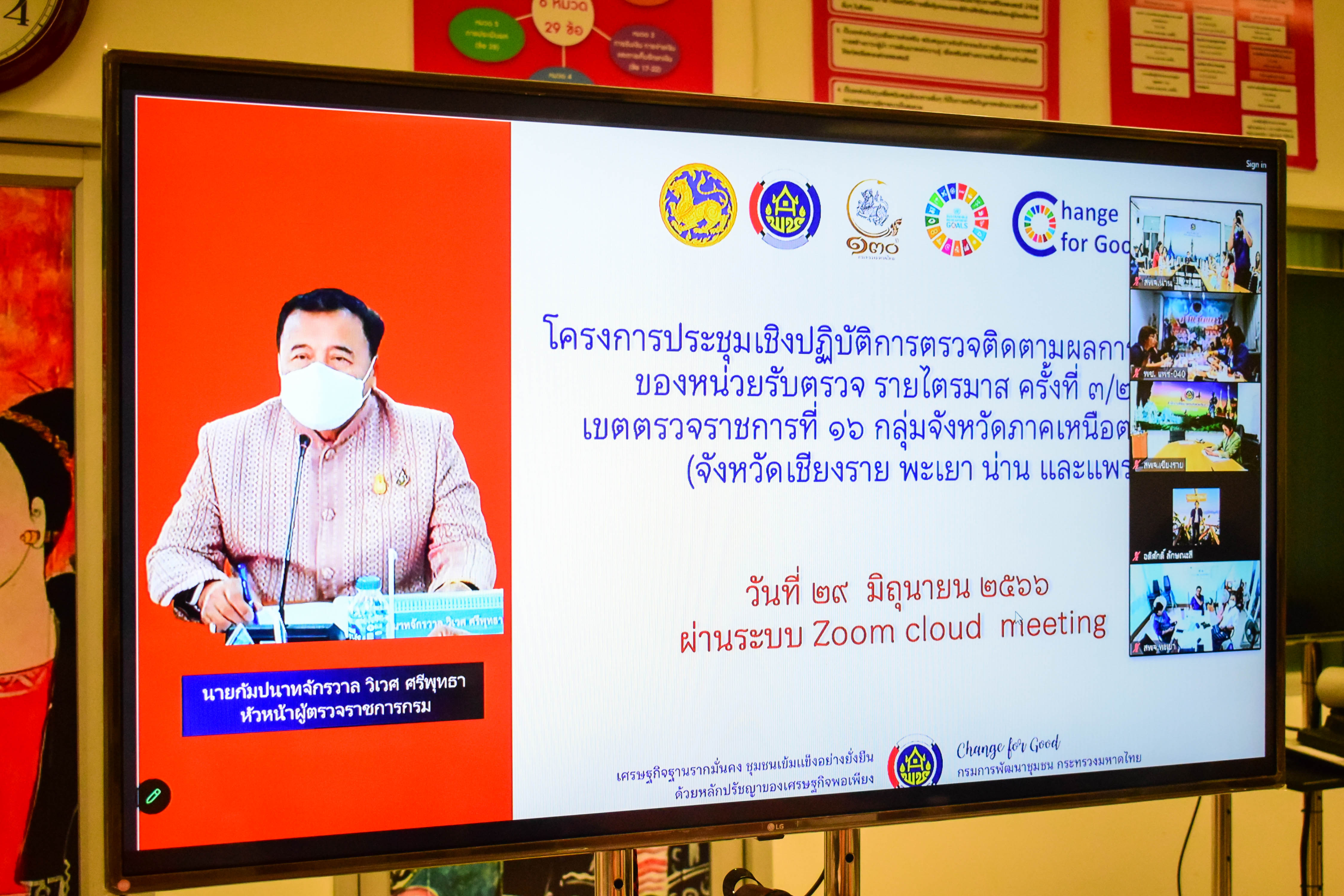 วันที่ 29 มิถุนายน 2566 เวลา 13.00 น. นายกัมปนาทจักรวาล วิเวศ ศรีพุทธา หัวหน้าผู้ตรวจราชการกรมการพัฒนาชุมชน เป็นประธานประชุมเชิงปฏิบัติการตรวจติดตามผลการดำเนินงานของหน่วยรับตรวจ ครั้งที่ 3/2566 ประจำเดือนมิถุนายน 2566 เขตตรวจราชการที่ 16 กลุ่มจังหวัดภาคเหนือตอนบน 2 (จังหวัดเชียงราย พะเยา แพร่ และน่าน) ผ่านระบบ zoom cloud meeting ณ ห้องประชุมสำนักตรวจราชการกรม ชั้น 3 กรมการพัฒนาชุมชน เพื่อเพื่อตรวจติดตามผลการดำเนินงานของหน่วยรับตรวจในปี พ.ศ. 2566 เป็นเวทีแลกเปลี่ยนเรียนรู้ผลการดำเนินงาน โครงการ/กิจกรรมสำคัญตามแผนปฏิบัติราชการและแผนการใช้จ่ายงบประมาณประจำปี พ.ศ. 2566 ตลอดจนปัญหา/อุปสรรค และแนวทางการแก้ไขปัญหาการดำเนินงานในพื้นที่ อีกทั้งเพื่อวางแผนการขับเคลื่อนการดำเนินงานโครงการ/กิจกรรม ปีงบประมาณ พ.ศ. 2566 ในพื้นที่เขตตรวจราชการที่ 16 กลุ่มจังหวัดภาคเหนือตอนบน 2 (จังหวัดเชียงราย พะเยา แพร่ และน่าน) โดยมีผู้เข้าร่วมการประชุมเชิงปฏิบัติการฯ ประกอบด้วย พัฒนาการจังหวัด , ผู้อำนวยการกลุ่มงานฯ ทุกกลุ่มงาน , พัฒนาการอำเภอ และเจ้าหน้าที่พัฒนาชุมชนจังหวัด