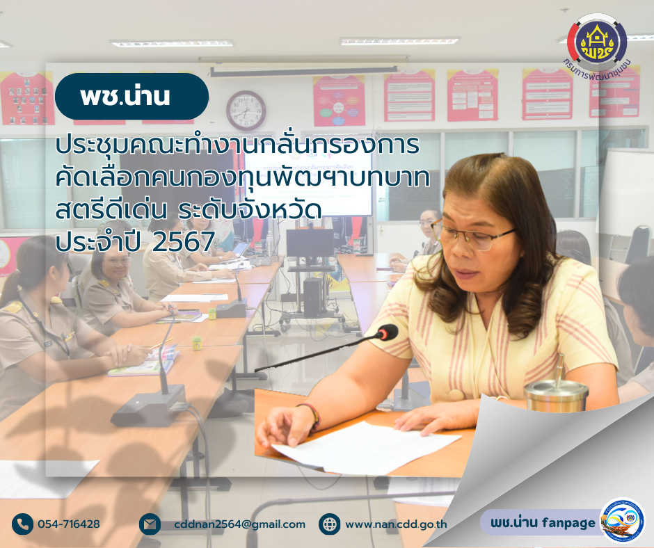 ว่าที่ร้อยตรีไพฑูรย์ ศรีราจันทร์ พัฒนาการจังหวัดน่าน มอบหมายให้นางณัฐนรี ศรีชัยยะ ผู้อำนวยการกลุ่มงานส่งเสริมการพัฒนาชุมชน เป็นประธานประชุมคณะทำงานกลั่นกรองการคัดเลือกคนกองทุนพัฒนาบทบาทสตรีดีเด่น ระดับจังหวัด ประจำปี 2567 เพื่อชี้แจงสร้างความรู้ความเข้าใจ และเตรียมความพร้อมดำเนินการคัดเลือกคนกองทุนพัฒนาบทบาทสตรีดีเด่นระดับจังหวัด ตามโครงการเชิดชูเกียรติคนกองทุนพัฒนาบทบาทสตรี ประจำปี 2567 กิจกรรมที่ 1 การคัดเลือกคนกองทุนพัฒนาบทบาทสตรีดีเด่น ระดับจังหวัด โดยจังหวัดน่านกำหนดดำเนินการคัดเลือก และนำเสนอผลการดำเนินงานผ่านระบบการประชุมออนไลน์ Wexeb Meeting ของกรมการพัฒนาชุมชน ในวันที่ 7 พฤษภาคม 2567