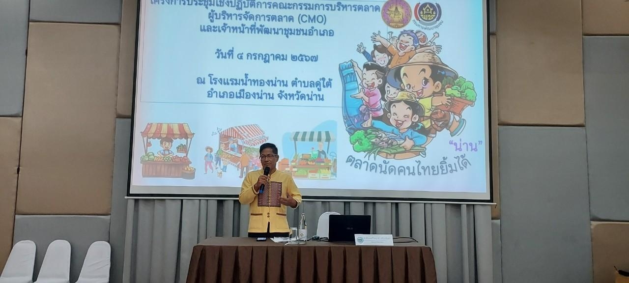 วันที่ 4 กรกฎาคม 2567 ว่าที่ร้อยตรีไพฑูรย์ ศรีราจันทร์ พัฒนาการจังหวัดน่าน เป็นประธานเปิดการประชุมเชิงปฏิบัติการพัฒนาตลาดนัดคนไทยยิ้มได้ ร่วมพบปะผู้เข้าร่วมการประชุมฯ โดยมีนางณัฐนรี ศรีชัยยะ ผู้อำนวยการกลุ่มงานส่งเสริมการพัฒนาชุมชน และเจ้าหน้าที่พัฒนาชุมชน จัดกิจกรรมประชุมเชิงปฏิบัติการคณะกรรมการบริหารการตลาด ผู้บริหารจัดการตลาด (CMO) และเจ้าหน้าที่พัฒนาชุมชนอำเภอ ณ โรงแรมน้ำทองน่าน ตำบลดู่ใต้ อำเภอเมืองน่าน จังหวัดน่าน โดยมีเป้าหมายผู้เข้าร่วมจำนวนทั้งสิ้น 75 ราย ประกอบด้วยคณะกรรมการบริหารการตลาด ผู้จัดการตลาด (CMO) จำนวน 29 แห่ง ๆ ละ 2 ราย รวม 58 ราย และเจ้าหน้าที่พัฒนาชุมชนอำเภอ ๆ ละ 1 ราย รวมทั้งสิ้น 75 ราย