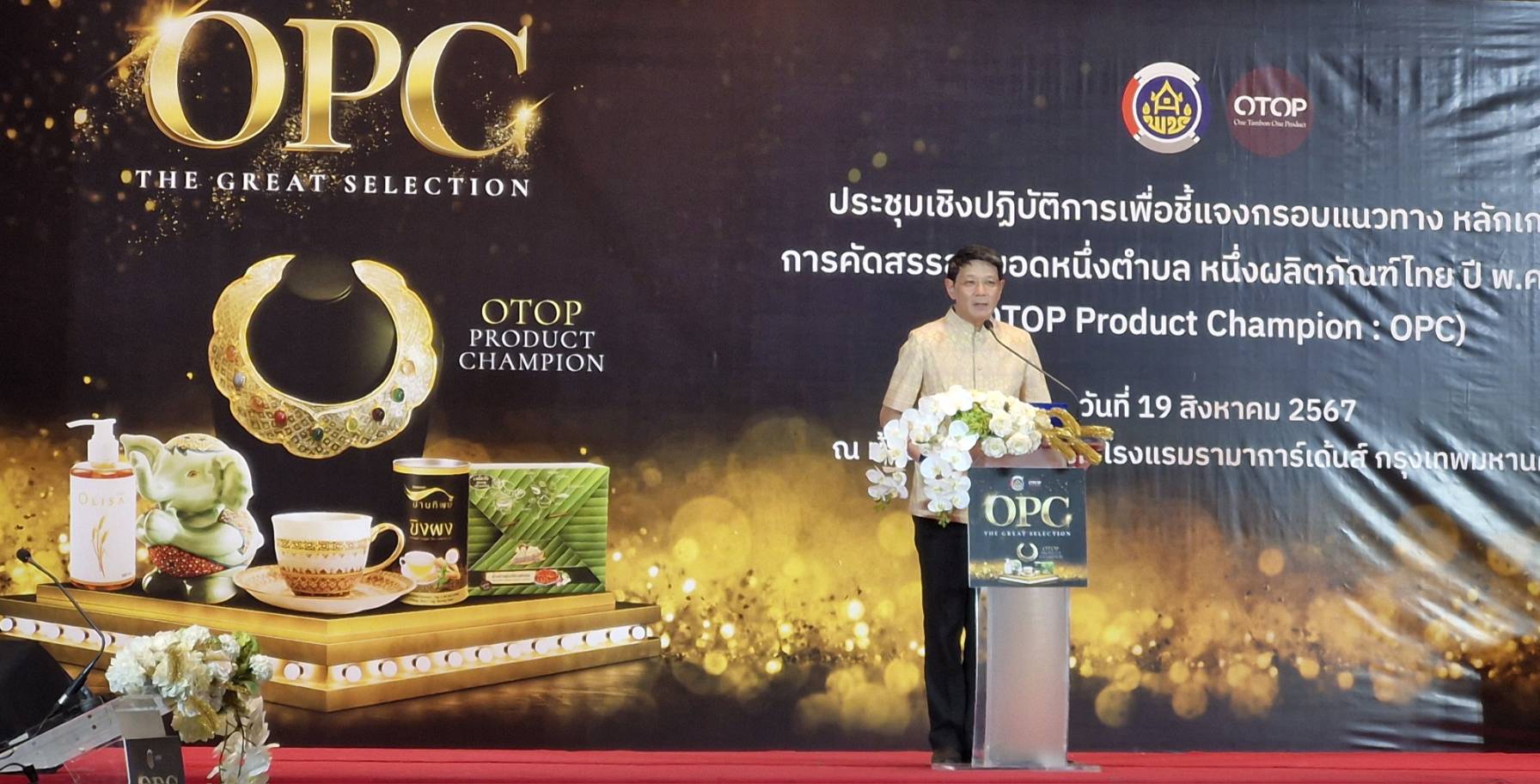 วันที่ 19 สิงหาคม 2567 ณ ห้องประชุมฟอร์จูน โรงแรมฟอร์จูนทาวน์ ถนนรัชดาภิเษก แขวงดินแดง เขตดินแดง กรุงเทพมหานคร นายสยาม ศิริมงคล อธิบดีกรมการพัฒนาชุมชน เป็นประธานเปิดโครงการประชุมเชิงปฏิบัติการ ชี้แจงกรอบแนวทาง หลักเกณฑ์การคัดสรรสุดยอดหนึ่งตำบลหนึ่งผลิตภัณฑ์ไทย ปี 2567 (OTOP Product Champion : OPC