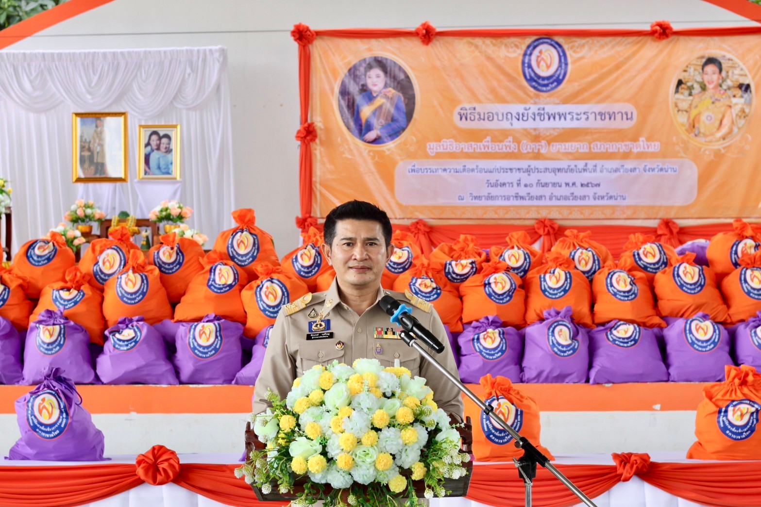วันที่ 10 กันยายน 2567 เวลา 13.30 น. ณ หอประชุมวิทยาลัยการอาชีพเวียงสา จังหวัดน่าน นายชัยนรงค์ วงศ์ใหญ่ ผู้ว่าราชการจังหวัดน่าน เป็นประธานในพิธีฯ กล่าวสำนึกในพระกรุณาธิคุณ พระเจ้าวรวงศ์เธอ พระองค์เจ้าโสมสวลี กรมหมื่นสุทธนารีนาถ และสมเด็จพระเจ้าลูกเธอ เจ้าฟ้าพัชรกิติยาภา นเรนทิราเทพยวดี กรมหลวงราชสาริณีสิริพัชร มหาวัชรราชธิดา พร้อมมอบถุงยังชีพพระราชทานมูลนิธิอาสาเพื่อนพึ่ง (ภาฯ) ยามยาก สภากาชาดไทย ถวายแด่พระภิกษุสงฆ์ จํานวน 50 รูป และมอบถุงยังชีพพระราชทานจำนวน 359 ถุงให้แก่ราษฎรที่ประสบอุทกภัยในพื้นที่ตำบลนาเหลืองและตำบลน้ำปั้ว จากนั้นผู้ว่าราชการจังหวัดน่านพร้อมด้วยนายนภษกร วัชระวิสิฐ ผู้ช่วยผู้จัดการมูลนิธิอาสาเพื่อนพึ่ง(ภาฯ)ยามยากสภากาชาดไทยและผู้บริหารจุฬาลงกรณ์วิทยาลัย มอบอุปกรณ์การศึกษา(เสื้อ กางเกง กระโปรง ถุงเท้า รองเท้าและเข็มขัด)ให้กับนักเรียนโรงเรียนน่านนคร จำนวน 164 ชุด และโรงเรียนบ้านไหล่น่าน(เสื้อ กางเกง กระโปรง ถุงเท้า รองเท้าและเข็มขัด) จำนวน 69 ชุด และชุดกีฬา จำนวน 69 ชุด โดยมี นายวรวิทย์ อินต๊ะใจ หัวหน้า.สนง.ปภ.จ.น่าน กล่าวรายงานสถานการณ์อุทกภัยในพื้นที่ พร้อมด้วย นายนพพร เรีองสว่าง นายอำเภอเวียงสา หัวหน้าส่วนราชการ กำนัน ผู้ใหญ่บ้าน และหน่วยงานที่เกี่ยวข้องเข้าร่วมพิธีฯ