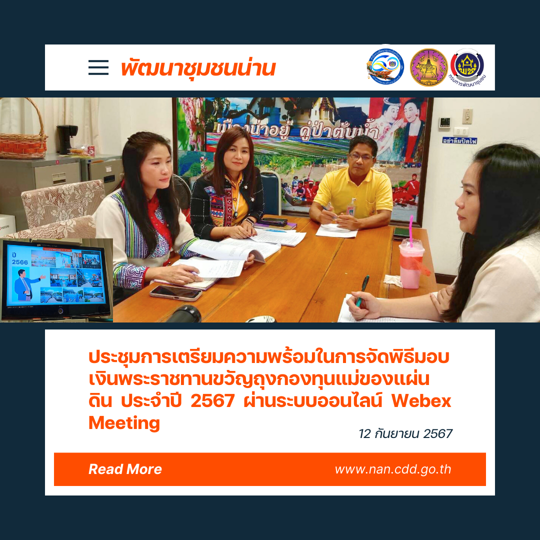#)สร้างสรรค์ชุมชน คนพช.น่าน(#) พช.น่าน ประชุมการเตรียมความพร้อมในการจัดพิธีมอบเงินพระราชทานขวัญถุงกองทุนแม่ของแผ่นดิน ประจำปี 2567 ผ่านระบบออนไลน์ Webex Meeting