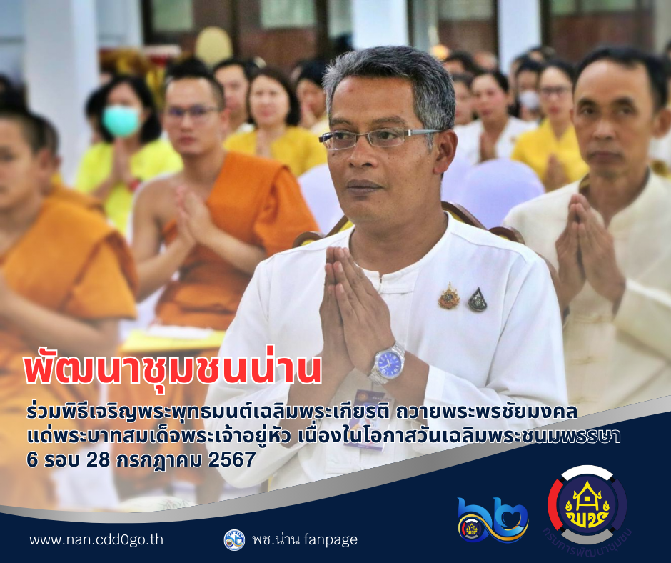 (#)สร้างสรรค์ชุมชน คนพช.น่าน(#) พช.น่าน ร่วมพิธีเจริญพระพุทธมนต์เฉลิมพระเกียรติ ถวายพระพรชัยมงคลแด่ พระบาทสมเด็จพระเจ้าอยู่หัว เนื่องในโอกาสวันเฉลิมพระชนมพรรษา 6 รอบ 28 กรกฎาคม 2567