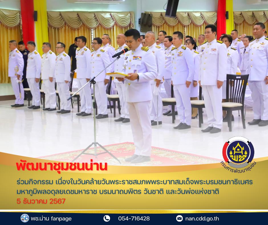 🌟ในการนี้ว่าที่ร้อยตรีไพฑูรย์ ศรีราจันทร์ พัฒนาการจังหวัดน่าน พร้อมด้วยนางสาวสุรางคนา ภักดี ผู้อำนวยการกลุ่มงานสารสนเทศการพัฒนาชุมชน ข้าราชการเจ้าหน้าที่พัฒนาชุมชน สำนักงานพัฒนาชุมชนจังหวัดน่าน เข้าร่วมพิธีดังกล่าวเพื่อน้อมรำลึกถึงพระมหากรุณาธิคุณ และถวายราชสดุดี แด่พระองค์พระมหากษัตริย์ ผู้ทรงสร้างสรรค์ความเจริญรุ่งเรืองแก่ประชาชนและประเทศไทย