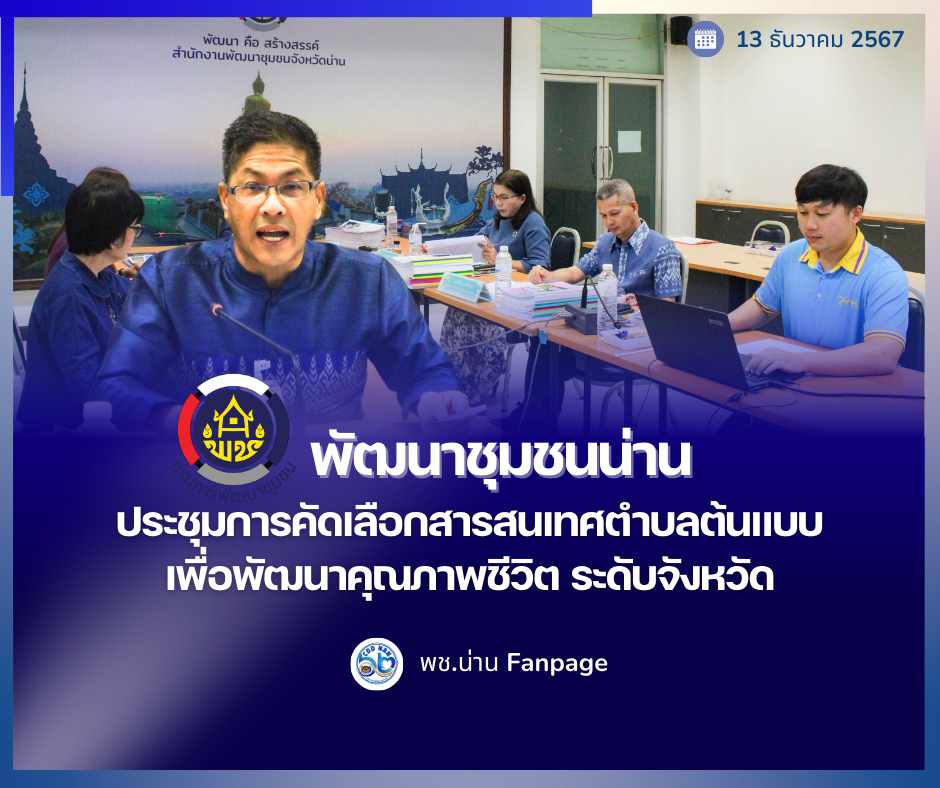 วันที่ 13 ธันวาคม 2567 เวลา 09.00 น. ณ ห้องประชุมสำนักงานพัฒนาชุมชน ชั้น 4 ศาลากลางจังหวัดน่าน ว่าที่ร้อยตรีไพฑูรย์ ศรีราจันทร์ พัฒนาการจังหวัดน่าน เป็นประธานการประชุมคัดเลือกสารสนเทศตำบลต้นแบบเพื่อพัฒนาคุณภาพชีวิต ระดับจังหวัด ประจำปีงบประมาณ พ.ศ. 2568 โดยมีผู้อำนวยการกลุ่มงาน ทั้ง 4 กลุ่ม และนักวิชาการพัฒนาชุมชนผู้รับผิดชอบ เข้าร่วมประชุมเพื่อพิจารณาคัดเลือกสารสนเทศตำบลต้นแบบเพื่อพัฒนาคุณภาพชีวิต ระดับจังหวัด ตามที่กรมการพัฒนาชุมชน ได้อนุมัติโครงการการจัดทำสารสนเทศตำบลแบบเพื่อการพัฒนาคุณภาพชีวิต มีวัตถุประสงค์เพื่อส่งเสริมให้ตำบลได้ใช้สารสนเทศในการพัฒนาคุณภาพชีวิตและบริหารจัดการชุมชน เผยแพร่และประชาสัมพันธ์การดำเนินงานสารสนเทศตำบลต้นแบบเพื่อพัฒนาคุณภาพชีวิต โดยให้สำนักงานพัฒนาชุมชนจังหวัด ดำเนินการคัดเลือกตำบลเป้าหมาย ระดับจังหวัด ๆ ละ 1 ตำบล เพื่อจัดทำสารสนเทศตำบลต้นแบบเพื่อพัฒนาคุณภาพชีวิต ประจำปี 2568