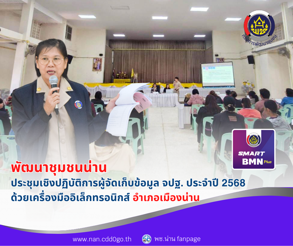 วันที่ 18 ธันวาคม 2567 เวลา 09.00 น. ณ หอประชุมที่ว่าการอำเภอเมืองน่าน นางอรนงค์ กาพรม พัฒนาการอำเภอเมืองน่าน พร้อมด้วยเจ้าหน้าที่พัฒนาชุมชน จัดประชุมเชิงปฏิบัติการผู้จัดเก็บข้อมูล (จปฐ.) ประจำปี 2568 ด้วยเครื่องมืออิเล็กทรอนิกส์ เพื่อขี้แจงแนวทางการดำเนินงานบริหารการจัดเก็บข้อมูลความจำเป็นพื้นฐาน (จปฐ.) ประจำปี 2568 เสริมสร้างความรู้ความเข้าใจตัวชี้วัดในการจัดเก็บข้อมูลความจำเป็นพื้นฐาน (จปฐ) ในห้วงแผนพัฒนาเศรษฐกิจและสังคมแห่งชาติ ฉบับที่ 13 และการใช้งานระบบโปรแกรมจัดเก็บข้อมูล SmartBmn แก่อาสาสมัครผู้จัดเก็บข้อมูล (จปฐ.) อำเภอเมืองน่าน