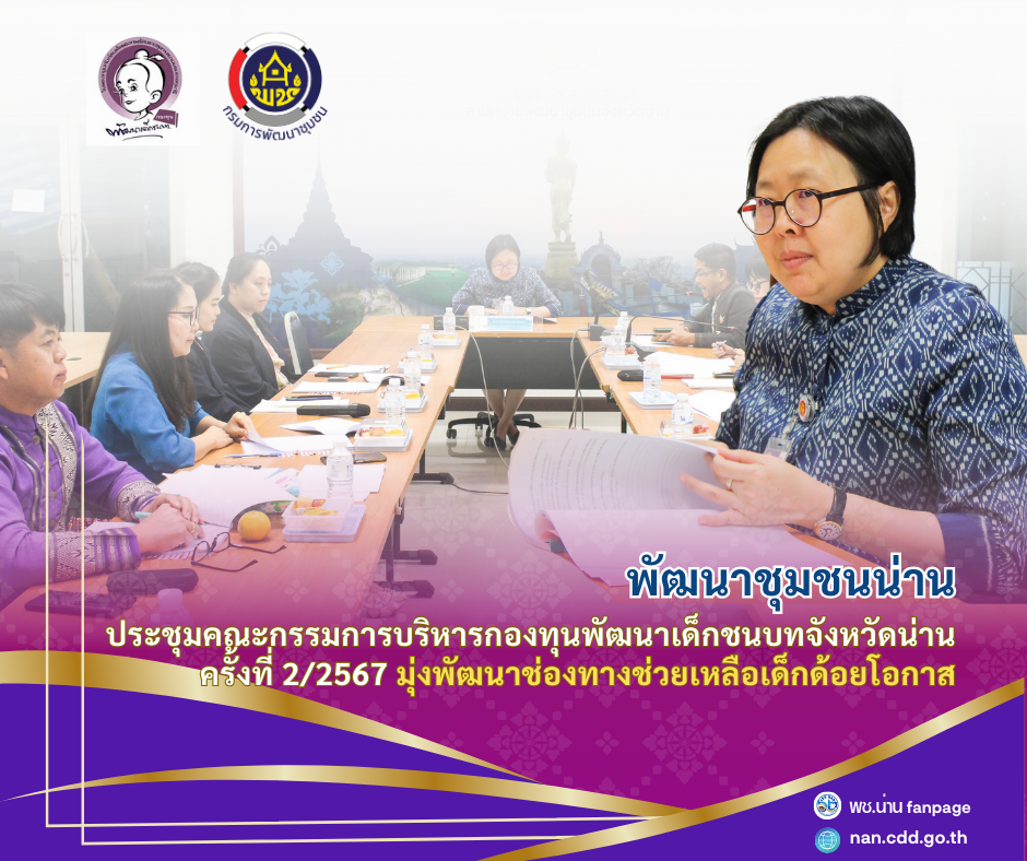 เมื่อวันที่ 19 ธันวาคม 2567 ที่ห้องประชุมสำนักงานเลขานุการคณะอนุกรรมการบริหารกองทุนพัฒนาบทบาทสตรีจังหวัดน่าน ชั้น 4 ศาลากลางจังหวัดน่าน นางวจิราพร อมาตยกุล รองผู้ว่าราชการจังหวัดน่าน เป็นประธานการประชุมคณะกรรมการบริหารกองทุนพัฒนาเด็กชนบทจังหวัดน่าน ครั้งที่ 2/2567 โดยมีวัตถุประสงค์เพื่อรายงานผลการดำเนินงาน และวางแผนพัฒนากองทุนให้สามารถช่วยเหลือเด็กด้อยโอกาสได้อย่างทั่วถึงและยั่งยืน โดยมีว่าที่ร้อยตรีไพฑูรย์ ศรีราจันทร์ พัฒนาการจังหวัดน่าน พร้อมด้วยนางสาวธัญภรณ์ ณ น่าน ผู้อำนวยการกลุ่มงานสนับสนุนและบริหารงานพัฒนาชุมชน และนักวิชาการพัฒนาชุมชน เข้าร่วมการประชุมเพื่อรายงานผลการดำเนินงาน
