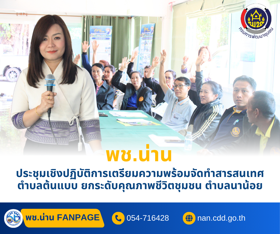 #น่านไม่เนิบ #NAN3FAST พัฒนาชุมชนน่าน ประชุมเชิงปฏิบัติการ เตรียมความพร้อมจัดทำสารสนเทศตำบลต้นแบบ ยกระดับคุณภาพชีวิตชุมชน ตำบลนาน้อย