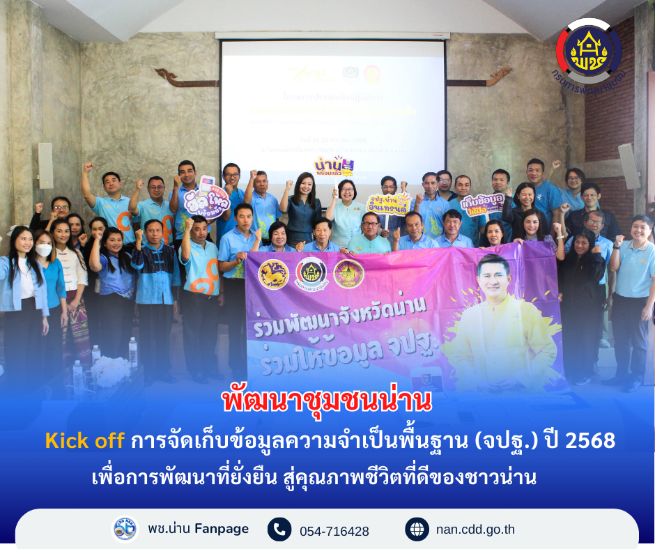 ทั้งนี้สำนักงานพัฒนาชุมชนจังหวัดน่าน ได้ขับเคลื่อนการบริหารการจัดเก็บข้อมูลความจำเป็นพื้นฐาน (จปฐ.) ปี 2568 เพื่อให้ได้ข้อมูลที่เป็นจริง ถูกต้อง ครบถ้วน และเป็นไปตามห้วงระยะเวลาและแนวทางที่กรมการพัฒนาชุมชนกำหนด โดยข้อมูล จปฐ. จะสะท้อนความเป็นอยู่และความต้องการที่แท้จริงของประชาชนในพื้นที่ทุกหมู่บ้านในจังหวัดน่าน ซึ่งข้อมูลนี้ถือเป็นหัวใจสำคัญในการวางแผนพัฒนาคุณภาพชีวิตและขับเคลื่อนการพัฒนาจังหวัดน่านและประเทศไทยอย่างยั่งยืน