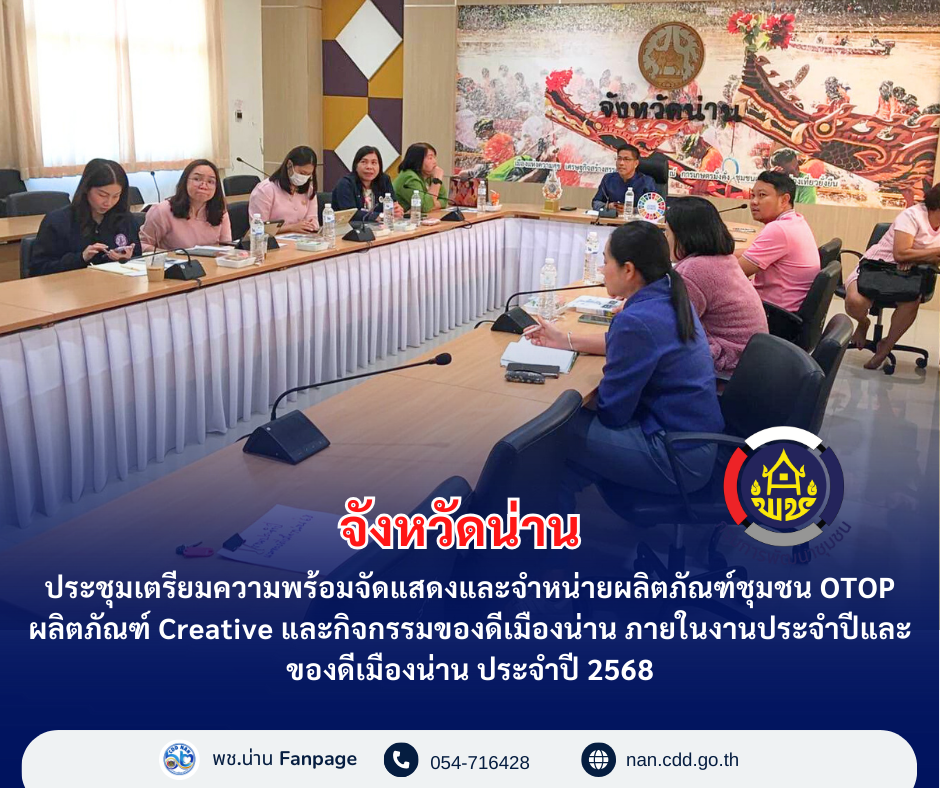 #น่านไม่เนิบ #NAN3FAST จังหวัดน่าน ประชุมเตรียมความพร้อมจัดแสดงและจำหน่ายผลิตภัณฑ์ชุมชน OTOP ผลิตภัณฑ์ Creative และกิจกรรมของดีเมืองน่าน ภายในงานประจำปีและของดีเมืองน่าน ประจำปี 2568