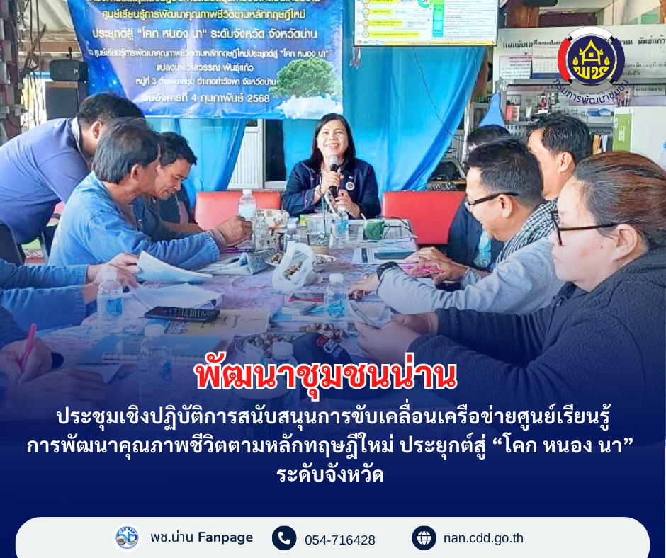 #น่านไม่เนิบ #NAN3FAST พช.น่าน ประชุมเชิงปฏิบัติการสนับสนุนการขับเคลื่อนเครือข่ายศูนย์เรียนรู้การพัฒนาคุณภาพชีวิตตามหลักทฤษฎีใหม่ ประยุกต์สู่ “โคก หนอง นา” ระดับจังหวัด