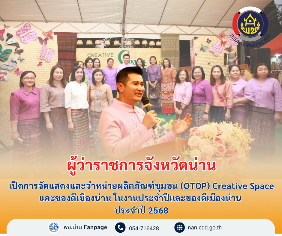 ผู้ว่าราชการจังหวัดน่าน กล่าวว่า งานจัดแสดงและจำหน่ายผลิตภัณฑ์ชุมชน (OTOP) Creative Space และของดีเมืองน่าน ในงานประจำปีและของดีเมืองน่าน ประจำปี 2568 ไม่เพียงแต่รวบรวมสินค้าและผลิตภัณฑ์ดีๆ ของจังหวัดน่าน แต่ยังเป็นเวทีสำคัญในการแสดงศักยภาพของจังหวัดน่าน ผ่านแนวทางการพัฒนาที่สอดคล้องกับยุทธศาสตร์ของจังหวัด ทั้งการยกระดับสินค้า การส่งเสริมด้านการตลาด และการขับเคลื่อนเศรษฐกิจสร้างสรรค์ ซึ่งในปีนี้ “Creative Space” เป็นหนึ่งในพื้นที่จัดแสดงสำคัญภายในงาน โดยได้รับความร่วมมือจากหน่วยงานต่างๆ ร่วมกันนำเสนอ แนวคิดสร้างสรรค์ นิทรรศการมีชีวิตและนวัตกรรมในการพัฒนาเศรษฐกิจของจังหวัดอีกด้วย
