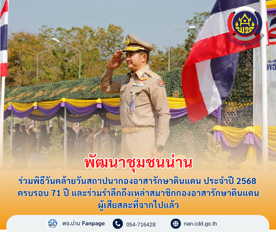 #น่านไม่เนิบ #NAN3FAST พช.น่าน ร่วมพิธีวันคล้ายวันสถาปนากองอาสารักษาดินแดน ประจำปี 2568 ครบรอบ 71 ปี และร่วมรำลึกถึงเหล่าสมาชิกกองอาสารักษาดินแดนผู้เสียสละที่จากไปแล้ว