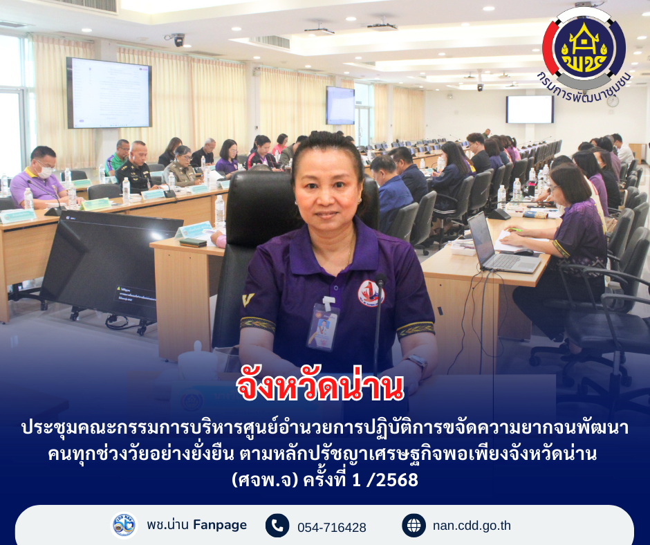 เมื่อวันที่ 5 มีนาคม 2568 ณ ห้องประชุมพระเจ้ามหาพรมสุรธาดา ชั้น 6 ศาลากลางจังหวัดน่าน นางวิไลวรรณ บุดาสา รองผู้ว่าราชการจังหวัดน่าน เป็นประธานประชุมคณะกรรมการบริหารศูนย์อำนวยการปฏิบัติการขจัดความยากจนพัฒนาคนทุกช่วงวัยอย่างยั่งยืน ตามหลักปรัชญาเศรษฐกิจพอเพียงจังหวัดน่าน (ศจพ.จ) โดยมีว่าที่ร้อยตรีไพฑูรย์ ศรีราจันทร์ พัฒนาการจังหวัดน่าน เข้าร่วมประชุมเพื่อรายงานผลการดำเนินงานขจัดความยากจน จังหวัดน่าน ในปี 2567 และร่วมวางแผนกำหนดแนวทางการดำเนินงานแก้ไขปัญหาความยากจน และพัฒนาคุณภาพชีวิตของประชาชน จังหวัดน่าน มุ่งสู่เป้าหมาย “อยู่รอด พอเพียง และยั่งยืน”
