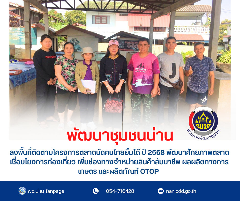 #น่านไม่เนิบ#NAN3FAST พช.น่าน ลงพื้นที่ติดตามโครงการตลาดนัดคนไทยยิ้มได้ ปี 2568 พัฒนาศักยภาพตลาด เชื่อมโยงการท่องเที่ยว เพิ่มช่องทางจำหน่ายสินค้าสัมมาชีพ ผลผลิตทางการเกษตร และผลิตภัณฑ์ OTOP