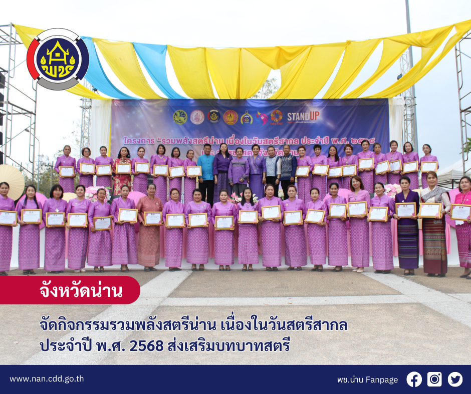 สำหรับในปี 256๘ คณะกรรมการพัฒนาสตรีจังหวัดน่าน ได้ร่วมกันจัดงาน วันสตรีสากล ประจำปี ๒๕6๘ ภายใต้โครงการ “รวมพลังสตรีน่าน เนื่องในวันสตรีสากล ประจำปี พ.ศ. ๒๕๖๘” ในวันศุกร์ที่ ๗ มีนาคม 256๘ โดยมีผู้นำสตรีจากทุกอำเภอ รวม 15 อำเภอ เข้าร่วมกิจกรรม จำนวน ๑,๐๕๐ คน ได้รับการสนับสนุนงบประมาณจากกองทุนพัฒนาบทบาทสตรีจังหวัดน่าน ประเภทเงินอุดหนุน จำนวนเงิน ๒๐๐,000 บาท และสำนักงานพัฒนาสังคมและความมั่นคงของมนุษย์จังหวัดน่าน โดยมีกิจกรรมที่น่าสนใจ อาทิเช่น กิจกรรมการเดินขบวนรวมพลังสตรีน่าน กิจกรรมแสดงฟ้อนรำของกลุ่มสตรีน่าน กิจกรรมรณรงค์สร้างกระแสการสวมใส่ผ้าไทย ผ้าพื้นเมืองน่าน การแสดงแบบ “ผ้าไทยใส่ให้สนุก” การจัดแสดงนิทรรศการ (สาธิตกิจกรรมโดยสมาชิกสตรี ๑๕ อำเภอ) และจำหน่ายผลิตภัณฑ์และผลผลิตของกลุ่มอาชีพสตรี/สมาชิกกองทุนพัฒนาบทบาทสตรี