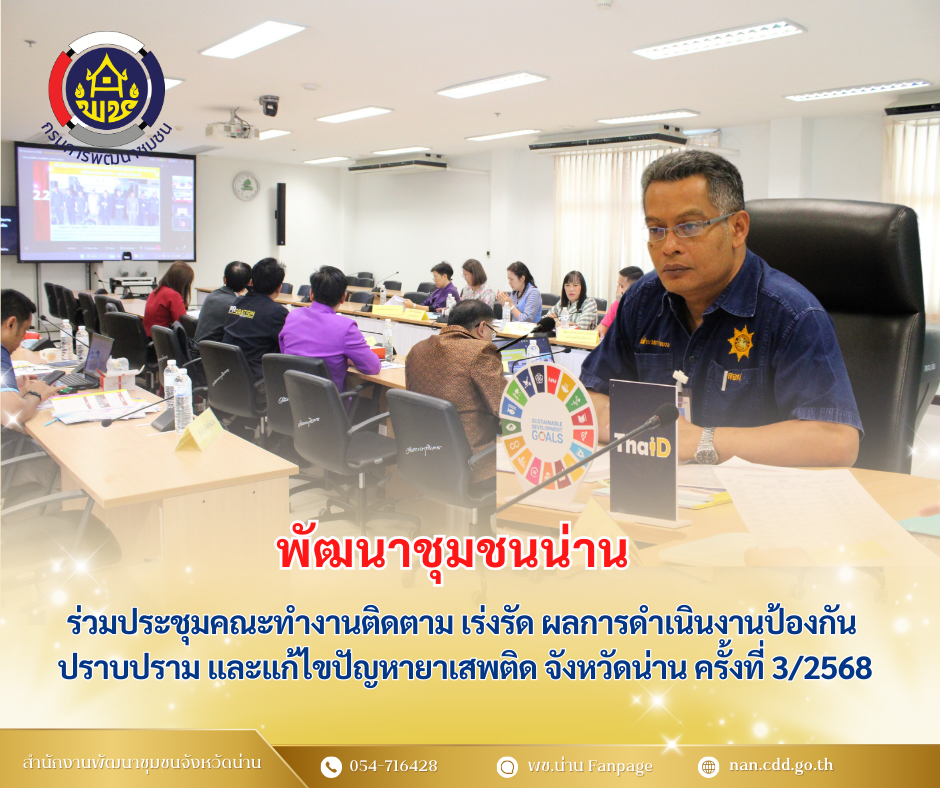 #น่านไม่เนิบ#NAN3FAST พช.น่าน ร่วมประชุมคณะทำงานติดตาม เร่งรัด ผลการดำเนินงานป้องกัน ปราบปราม และแก้ไขปัญหายาเสพติด จังหวัดน่าน ครั้งที่ 3/2568