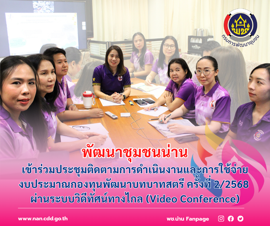 วันที่ 12 มีนาคม 2568 ว่าที่ร้อยตรีไพฑูรย์ ศรีราจันทร์ พัฒนาการจังหวัดน่าน ได้มอบหมายให้นางรัตติยา ศรีสุข ผู้อำนวยการกลุ่มงานประสานและสนับสนุนการบริหารงานพัฒนาชุมชน พร้อมด้วยนักวิชาการพัฒนาชุมชน และเจ้าหน้าที่กองทุนฯ เข้าร่วมการประชุมติดตามการดำเนินงานและการใช้จ่ายงบประมาณกองทุนพัฒนาบทบาทสตรี ประจำปีงบประมาณ พ.ศ. 2568 ผ่านระบบวิดีทัศน์ทางไกล (Video Conference) ครั้งที่ 2/2568 เพื่อติดตามและสนับสนุนการขับเคลื่อนกองทุนพัฒนาบทบาทสตรีให้มีประสิทธิภาพและเกิดประโยชน์สูงสุดแก่สมาชิกกองทุนฯ