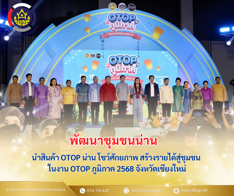 สำนักงานพัฒนาชุมชนจังหวัดน่าน ขอเชิญชวนประชาชนและนักท่องเที่ยวร่วมสนับสนุนสินค้า OTOP ของจังหวัดน่านและทั่วประเทศ เพื่อช่วยกระตุ้นเศรษฐกิจฐานราก สร้างรายได้ให้แก่ชุมชน และร่วมอนุรักษ์ภูมิปัญญาท้องถิ่นให้คงอยู่สืบไป งาน OTOP ภูมิภาค 2568 จังหวัดเชียงใหม่ จัดขึ้นตั้งแต่วันที่ 10-16 มีนาคม 2568