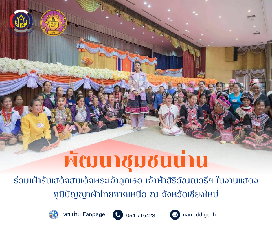 วันที่ 13 มีนาคม 2568 นายชัยนรงค์ วงศ์ใหญ่ ผู้ว่าราชการจังหวัดน่าน พร้อมด้วย ว่าที่ร้อยตรีไพฑูรย์ ศรีราจันทร์ พัฒนาการจังหวัดน่าน และ นางณัฐนรี ศรีชัยยะ ผู้อำนวยการกลุ่มงานส่งเสริมการพัฒนาชุมชน สำนักงานพัฒนาชุมชนจังหวัดน่าน ร่วมเฝ้ารับเสด็จ สมเด็จพระเจ้าลูกเธอ เจ้าฟ้าสิริวัณณวรีนารีรัตนราชกัญญา ในโอกาสเสด็จไปทอดพระเนตรนิทรรศการและการจัดแสดงผลงานภูมิปัญญาผ้าไทย และงานหัตถกรรมชุมชนภาคเหนือ ณ หอประชุมทีปังกรรัศมีโชติ มหาวิทยาลัยราชภัฏเชียงใหม่ อำเภอแม่ริม จังหวัดเชียงใหม่