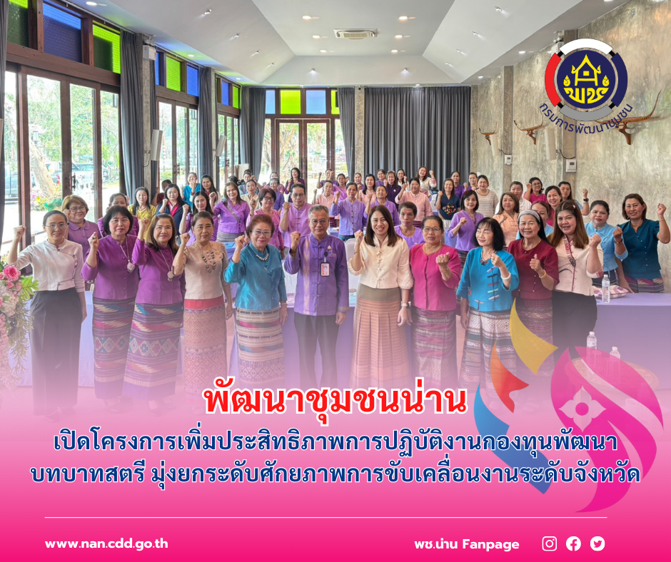 สำนักงานพัฒนาชุมชนจังหวัดน่านดำเนินโครงการเพิ่มประสิทธิภาพการปฏิบัติงานกองทุนพัฒนาบทบาทสตรีแก่กลไกการขับเคลื่อนกองทุนพัฒนาบทบาทสตรี กิจกรรมที่ 2 เพิ่มประสิทธิภาพการปฏิบัติงานกองทุนพัฒนาบทบาทสตรีแก่กลไกการขับเคลื่อนกองทุนพัฒนาบทบาทสตรีระดับจังหวัด โดยมีวัตถุประสงค์เพื่อสร้างความรู้ความเข้าใจในการดำเนินงานกองทุนพัฒนาบทบาทสตรีให้กับกลไกการขับเคลื่อนงาน พร้อมทั้งพัฒนาทักษะที่จำเป็นในการบริหารจัดการกองทุนอย่างมีประสิทธิภาพและยั่งยืน