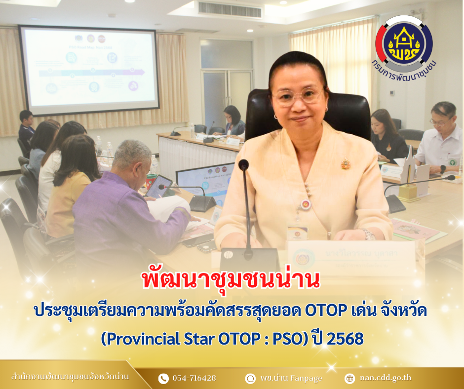 วันที่ 28 มีนาคม 2568 เวลา 13.30 น. ที่ห้องประชุมเจ้าสุมนเทวราช ชั้น 6 ศาลากลางจังหวัดน่าน สำนักงานพัฒนาชุมชนจังหวัดน่าน จัดประชุมคณะกรรมการคัดสรรสุดยอดผลิตภัณฑ์ OTOP เด่น จังหวัด (Provincial Star OTOP : PSO) ปี พ.ศ. 2568 โดยมีนางวิไลวรรณ บุดาสา รองผู้ว่าราชการจังหวัดน่าน เป็นประธานในการประชุม โดยมีนายชัยณรงค์ รักษารัตน์ พัฒนาการจังหวัดน่าน พร้อมด้วยนางณัฐนรี ศรีชัยยะ ผู้อำนวยการกลุ่มงานส่งเสริมการพัฒนาชุมชน หัวหน้าส่วนราชการที่เกี่ยวข้องเข้าร่วมประชุม เพื่อเตรียมความพร้อมคัดสรรสุดยอด OTOP เด่น จังหวัด (PSO) ปี 2568
