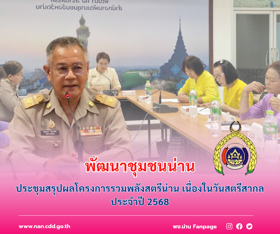 นายชัยณรงค์ รักษารัตน์ พัฒนาการจังหวัดน่าน พร้อมด้วยนางณัฐนรี ศรีชัยยะ ผู้อำนวยการกลุ่มงานส่งเสริมการพัฒนาชุมชน และเจ้าหน้าที่พัฒนาชุมชน สำนักงานพัฒนาชุมชนจังหวัดน่าน ได้เข้าร่วมประชุมและรายงานถึงบทบาทของสำนักงานพัฒนาชุมชนในการสนับสนุนกิจกรรมพัฒนาสตรี รวมถึงการส่งเสริมบทบาทสตรีในด้านเศรษฐกิจและสังคม ซึ่งในปีนี้ โครงการรวมพลังสตรีน่านมุ่งเน้นการส่งเสริมศักยภาพสตรีผ่านกิจกรรมอบรมเชิงปฏิบัติการ การพัฒนาภาวะผู้นำ และการสร้างโอกาสทางเศรษฐกิจให้แก่สตรีในพื้นที่