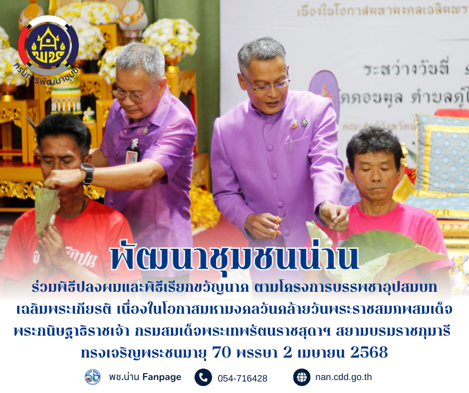 #น่านไม่เนิบ#NAN3FAST พช.น่าน ร่วมพิธีปลงผมและพิธีเรียกขวัญนาค ตามโครงการบรรพชาอุปสมบท เฉลิมพระเกียรติ เนื่องในโอกาสมหามงคลวันคล้ายวันพระราชสมภพสมเด็จพระกนิษฐาธิราชเจ้า กรมสมเด็จพระเทพรัตนราชสุดาฯ สยามบรมราชกุมารี ทรงเจริญพระชนมายุ 70 พรรษา 2 เมษายน 2568