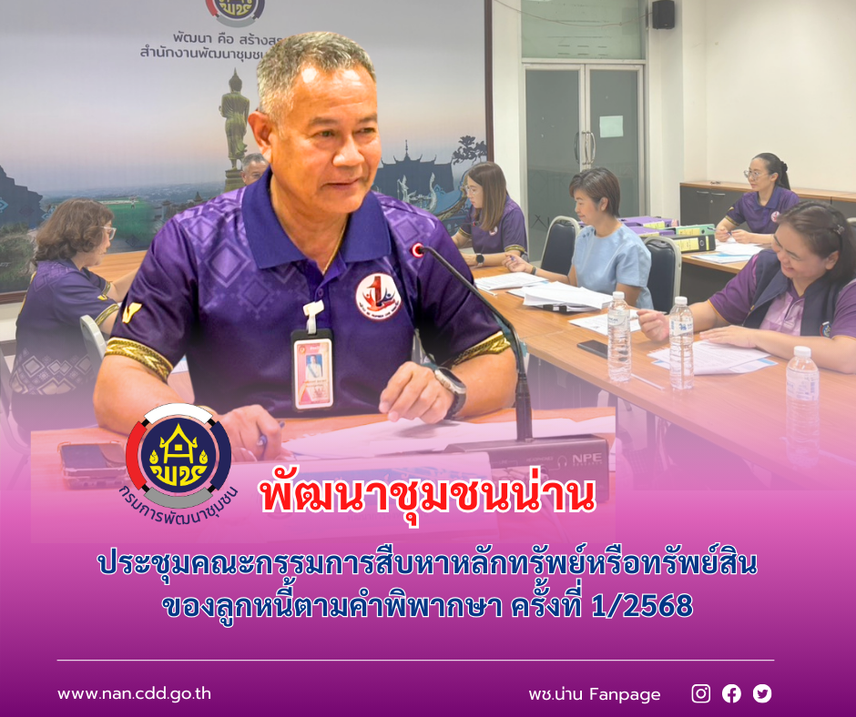 วันที่ 2 เมษายน 2568 เวลา 13.30 น. สำนักงานพัฒนาชุมชนจังหวัดน่านจัดประชุม คณะกรรมการสืบหาหลักทรัพย์หรือทรัพย์สินของลูกหนี้ตามคำพิพากษา ครั้งที่ 1/2568 ณ ห้องประชุมสำนักงานเลขานุการคณะอนุกรรมการบริหารกองทุนพัฒนาบทบาทสตรีระดับจังหวัด จังหวัดน่าน ชั้น 4 ศาลากลางจังหวัดน่าน โดยมี นายชัยณรงค์ รักษารัตน์ พัฒนาการจังหวัดน่าน เป็นประธานในการประชุม