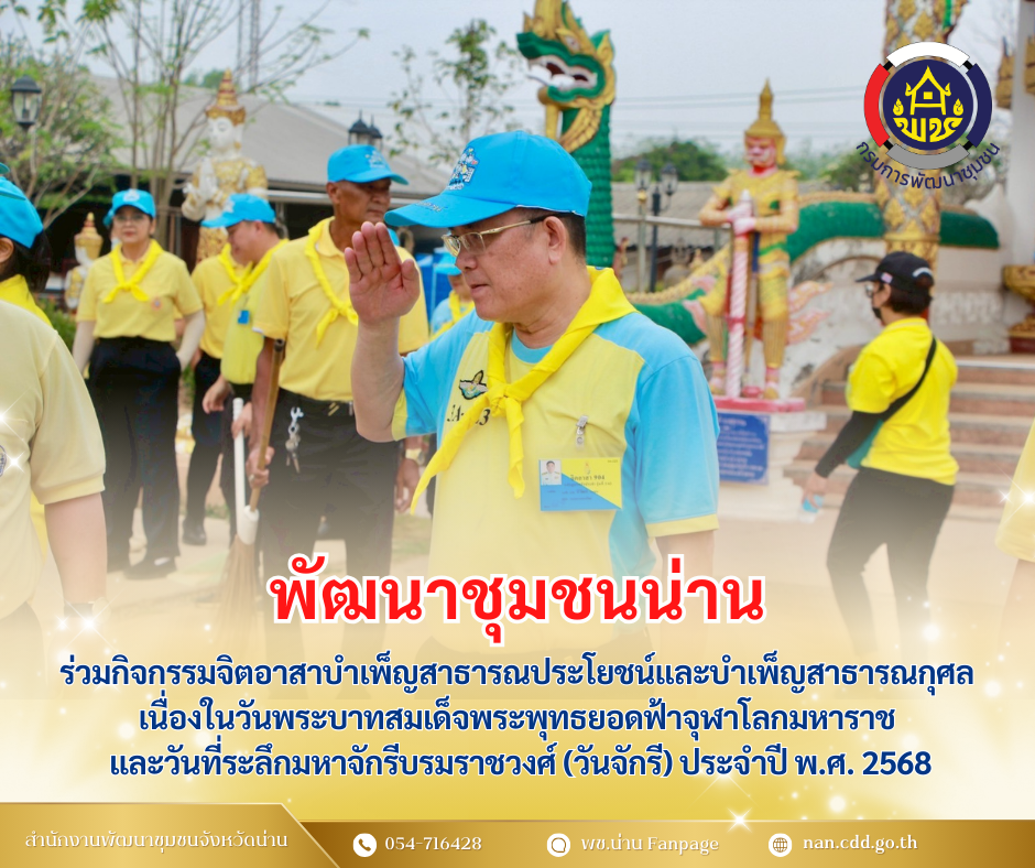 #น่านไม่เนิบ#NAN3FAST พช.น่าน ร่วมกิจกรรมจิตอาสาบำเพ็ญสาธารณประโยชน์และบำเพ็ญสาธารณกุศล เนื่องในวันพระบาทสมเด็จพระพุทธยอดฟ้าจุฬาโลกมหาราช และวันที่ระลึกมหาจักรีบรมราชวงศ์ (วันจักรี) ประจำปี พ.ศ. 2568