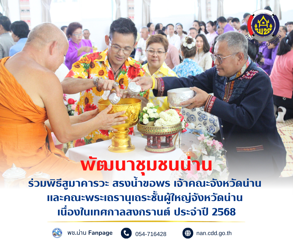 #น่านไม่เนิบ#NAN3FAST พช.น่าน ร่วมพิธีสูมาคารวะ สรงน้ำขอพร เจ้าคณะจังหวัดน่าน และคณะพระเถรานุเถระชั้นผู้ใหญ่จังหวัดน่าน เนื่องในเทศกาลสงกรานต์ ประจำปี 2568