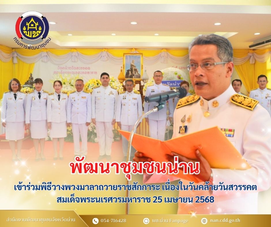 วันที่ 25 เมษายน 2568 ณ ห้องประชุมเจ้ามหาวงศ์ ชั้น 6 ศาลากลางจังหวัดน่าน นายชัยณรงค์ รักษารัตน์ พัฒนาการจังหวัดน่าน เข้าร่วมพิธีวางพวงมาลาถวายราชสักการะ เนื่องในวันคล้ายวันสวรรคตของสมเด็จพระนเรศวรมหาราช เพื่อแสดงความจงรักภักดี และน้อมรำลึกในพระมหากรุณาธิคุณอันหาที่สุดมิได้
