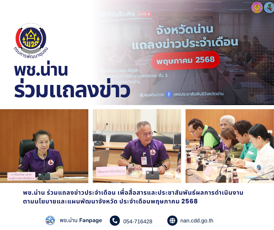 พช.น่าน ร่วมแถลงข่าวประจำเดือน เพื่อสื่อสารและประชาสัมพันธ์ผลการดำเนินงาน ตามนโยบายและแผนพัฒนาจังหวัด ประจำเดือนพฤษภาคม 2568