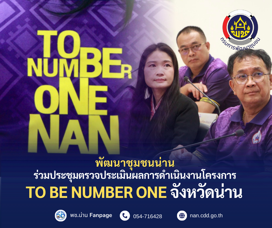 วันที่ 22 พฤษภาคม 2568 เวลา 09.00 น. ณ ห้องประชุมเจ้าฟ้าอัตถวรปัญโญ ชั้น 2 ศาลากลางจังหวัดน่าน ดร.กิตติ สุทธิจิตไพศาล ประธานกรรมการ และ นายนิวัฒน์ เอี่ยมเที่ยง คณะกรรมการตรวจพื้นที่ชมรม TO BE NUMBER ONE ลงพื้นที่ตรวจประเมินผลการดำเนินงาน โครงการ TO BE NUMBER ONE จังหวัดน่าน โดยมี นายชัยนรงค์ วงศ์ใหญ่ ผู้ว่าราชการจังหวัดน่าน พร้อมด้วยหัวหน้าส่วนราชการ หน่วยงานที่เกี่ยวข้อง และภาคีเครือข่าย เข้าร่วมให้ข้อมูลและนำเสนอผลการดำเนินงาน