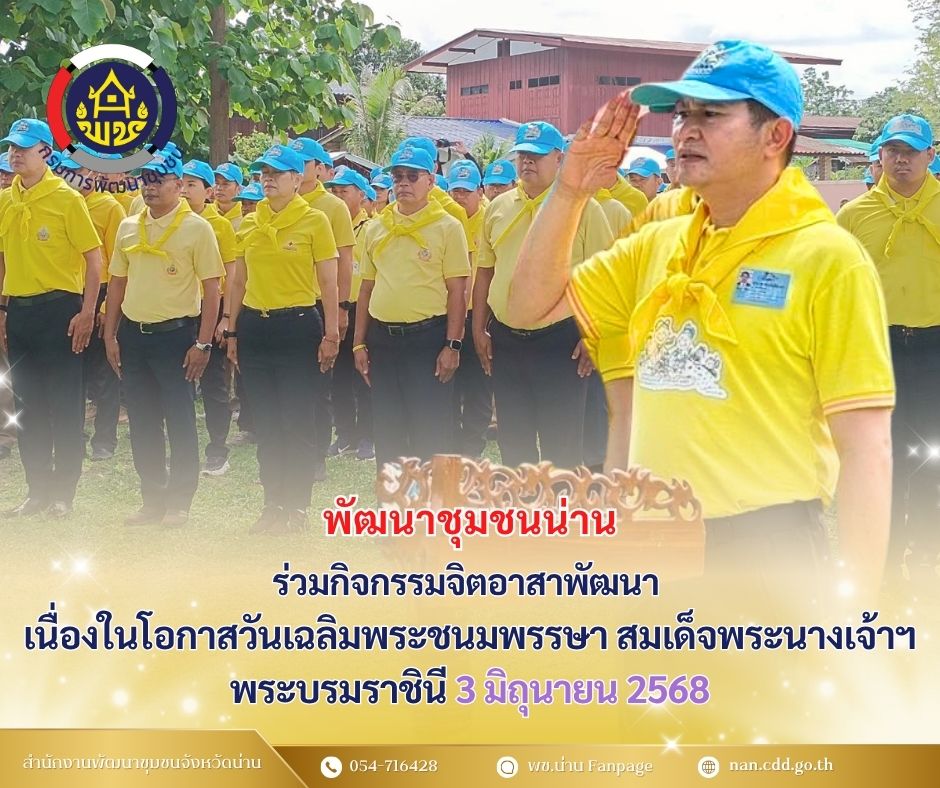 วันที่ 3 มิถุนายน 2568 นายชัยนรงค์ วงศ์ใหญ่ ผู้ว่าราชการจังหวัดน่าน นำข้าราชการ เจ้าหน้าที่ ภาคประชาชน และจิตอาสาพระราชทาน ร่วมกิจกรรม จิตอาสาพัฒนา เนื่องในโอกาสวันเฉลิมพระชนมพรรษา สมเด็จพระนางเจ้าสุทิดา พัชรสุธาพิมลลักษณ พระบรมราชินีวัดนาเหลืองม่วงขวา ตำบลน้ำแก่น อำเภอภูเพียง จังหวัดน่าน