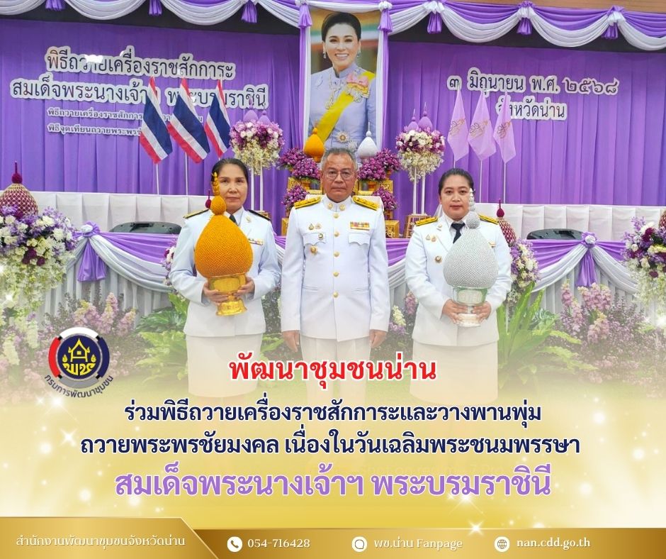 พช.น่าน ร่วมพิธีถวายเครื่องราชสักการะและวางพานพุ่มถวายพระพรชัยมงคล เนื่องในวันเฉลิมพระชนมพรรษา สมเด็จพระนางเจ้าฯ พระบรมราชินี