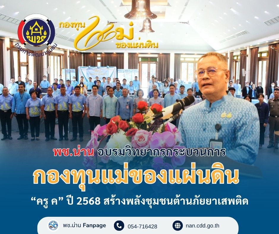 วันที่ 9 มิถุนายน 2568 ณ โรงแรมน่านกรีนเลควิว รีสอร์ท ตำบลไชยสถาน อำเภอเมืองน่าน จังหวัดน่าน นายชัยนรงค์ วงศ์ใหญ่ ผู้ว่าราชการจังหวัดน่าน มอบหมายให้ นายชัยณรงค์ รักษารัตน์ พัฒนาการจังหวัดน่าน เป็นประธานในพิธีเปิดโครงการ อบรมวิทยากรกระบวนการกองทุนแม่ของแผ่นดิน (ครู ค) พื้นที่จังหวัดน่าน ประจำปี 2568 เพื่อเสริมสร้างศักยภาพและพัฒนาบุคลากรเครือข่ายกองทุนแม่ของแผ่นดินในการป้องกันและแก้ไขปัญหายาเสพติดในระดับพื้นที่ โดยมีนายเสกสถิตย์ ทารินทร์ ประธานเครือข่ายกองทุนแม่ของแผ่นดินจังหวัดน่าน กล่าวรายงาน พร้อมด้วยนางสาวสุจิตรา สุวรรณโรจน์ ผู้อำนวยการกลุ่มงานสารสนเทศการพัฒนาชุมชน นางรัตติยา ศรีสุข ผู้อำนวยการกลุ่มงานประสานและสนับสนุนการบริหารงานพัฒนาชุมชน หัวหน้าส่วนราชการ พัฒนาการอำเภอเมืองน่าน เครือข่ายกองทุนแม่ของแผ่นดินจังหวัดน่าน สมาชิกกองทุนแม่ของแผ่นดินจังหวัดน่าน และเจ้าหน้าที่พัฒนาชุมชน เข้าร่วม