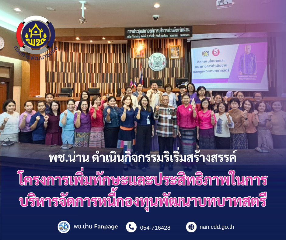 วันที่ 19 มิถุนายน 2568 นายชัยณรงค์ รักษารัตน์ พัฒนาการจังหวัดน่าน เป็นประธานเปิดการอบรมโครงการเพิ่มทักษะและประสิทธิภาพในการบริหารจัดการหนี้กองทุนพัฒนาบทบาทสตรี โดยพบปะและมอบนโยบายและแนวทางการดำเนินงานกองทุนพัฒนาบทบาทสตรี ณ ห้องประชุมองค์การบริหารส่วนจังหวัดน่าน โดยมีวัตถุประสงค์เพื่อเพิ่มทักษะและประสิทธิภาพแก่พัฒนาการอำเภอและเจ้าหน้าที่พัฒนาชุมชนที่รับผิดชอบงานกองทุนพัฒนาบทบาทสตรีระดับอำเภอ ในการบริหารจัดการหนี้ ให้บรรลุวัตถุประสงค์ตามตัวชี้วัดการปฏิบัติราชการและเป็นไปตามนโยบายของกรมการพัฒนาชุมชน ผู้เข้าร่วมโครงการฯ จำนวน 34 คน ประกอบด้วย พัฒนาการอำเภอ จำนวน 15 คน เจ้าหน้าที่พัฒนาชุมชนที่รับผิดชอบงานกองทุนพัฒนาบทบาทสตรีระดับอำเภอ จำนวน 15 คน และเจ้าหน้าที่โครงการฯ จำนวน 4 คน โดยไม่ใช้งบประมาณจากทางราชการแต่อย่างใด ซึ่งมีการดำเนินกิจกรรม ดังนี้