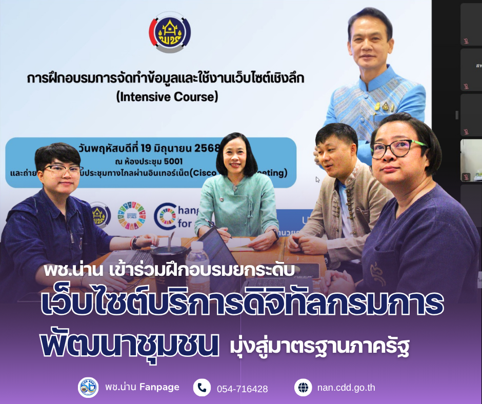 วันที่ 19 มิถุนายน 2568 เวลา 09.00 น. นายชัยณรงค์ รักษารัตน์ พัฒนาการจังหวัดน่าน มอบหมายให้นางสาวสุจิตรา สุวรรณโรจน์ ผู้อำนวยการกลุ่มงานสารสนเทศการพัฒนาชุมชน พร้อมด้วยเจ้าหน้าที่พัฒนาชุมชนผู้รับผิดชอบงานบริหารจัดการเว็บไซต์ของจังหวัดและอำเภอ เข้าร่วมการฝึกอบรมเพื่อเตรียมความพร้อมสำหรับการจัดทำข้อมูลและใช้งานเว็บไซต์เชิงลึก (Intensive Course) ผ่านระบบการประชุมทางไกลผ่านอินเตอร์เน็ต (Cisco Webex Meeting) โดยมีวัตถุประสงค์เพื่อเพิ่มประสิทธิภาพเว็บไซต์บริการดิจิทัลของกรมการพัฒนาชุมชนให้เป็นไปตามมาตรฐานเว็บไซต์ภาครัฐ